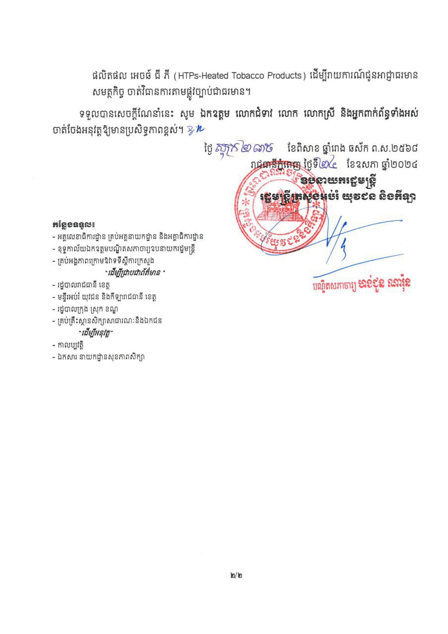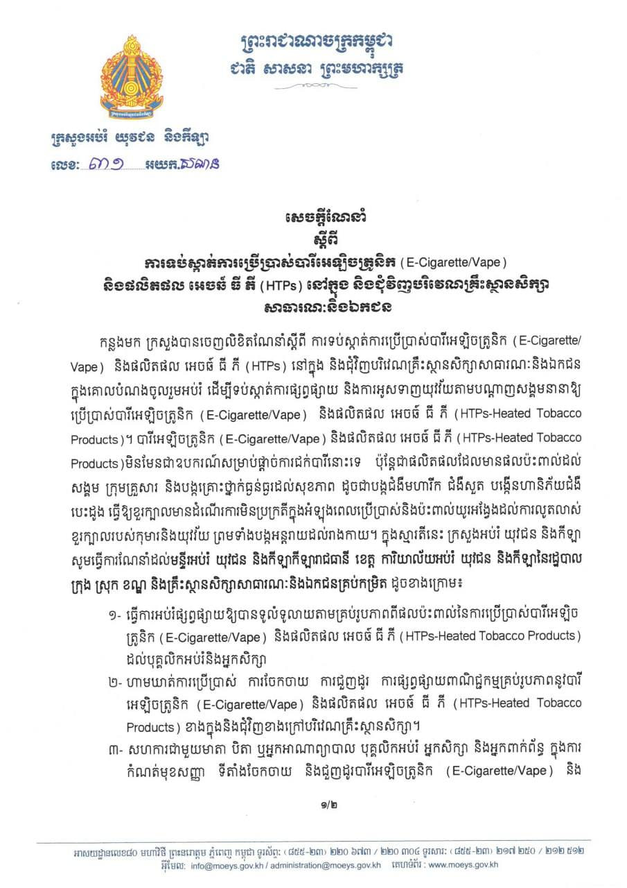 កន្លងមក ក្រសួងបានចេញលិខិតណែនាំស្តីពី ការទប់ស្កាត់ការប្រើប្រាស់បារីអេឡិចត្រូនិក (E-Cigarette/ Vape) និងផលិតផល អេចម៍ ធី ភី (HTPs) នៅក្នុង និងជុំវិញបរិវេណគ្រឹះស្ថានសិក្សាសាធារណៈនិងឯកជន ក្នុងគោលបំណងចូលរួមអប់រំ ដើម្បីទប់ស្កាត់ការផ្សព្វផ្សាយ និងការអូសទាញយុវវ័យតាមបណ្តាញសង្គមនានាឱ្យ ប្រើប្រាស់បារីអេឡិចត្រូនិក (E-Cigarette/Vape) និងផលិតផល អេចន៍ ធី ភី (HTPs-Heated Tobacco Products)។ បារីអេឡិចត្រូនិក (E-Cigarette/Vape) និងផលិតផល អេចន៍ ធី ភី (HTPs-Heated Tobacco Products) មិនមែនជាឧបករណ៍សម្រាប់ផ្តាច់ការជក់បារីនោះទេ ប៉ុន្តែជាផលិតផលដែលមានផលប៉ះពាល់ដល់ សង្គម ក្រុមគ្រួសារ និងបង្កគ្រោះថ្នាក់ធ្ងន់ធ្ងរដល់សុខភាព ដូចជាបង្កជំងឺមហារីក ជំងឺសួត បង្កើនហានិភ័យជំងឺ បេះដូង ធ្វើឱ្យខួរក្បាលមានដំណើរការមិនប្រក្រតីក្នុងអំឡុងពេលប្រើប្រាស់និងប៉ះពាល់យូរអង្វែងដល់ការលូតលាស់ ខួរក្បាលរបស់កុមារនិងយុវវ័យ ព្រមទាំងបង្កអន្តរាយដល់រាងកាយ។