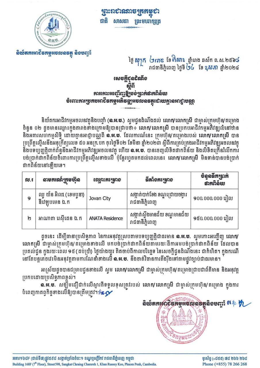 និយ័តករអាជីវកម្មអចលនវត្ថុនិងបញ្ចាំ (ន.អ.ប.) សូមជូនដំណឹងដល់ ម្ចាស់ក្រុមហ៊ុន/គម្រោង ចំនួន ០២ ឱ្យបានជ្រាបថា៖ លោក/លោកស្រី បានប្រកបអាជីវកម្មអភិវឌ្ឍលំនៅឋាន និងអគារសហកម្មសិទ្ធិ ដោយគ្មានអាជ្ញាបណ្ណពី ន.អ.ប. ដែលការណ៍នេះ ក្រុមហ៊ុន/គម្រោងរបស់ លោក/លោកស្រី បាន ប្រព្រឹត្តល្មើសនឹងអនុក្រឹត្យលេខ ៥០ អនក្រ.បក ចុះថ្ងៃទី០២ ខែមីនា ឆ្នាំ២០២៣ ស្តីពីការគ្រប់គ្រងអាជីវកម្មអភិវឌ្ឍអចលនវត្ថុ និងបទប្បញ្ញត្តិពាក់ព័ន្ធនឹងអាជីវកម្មអភិវឌ្ឍអចលនវត្ថុ ហើយ ន.អ.ប. បានចេញលិខិតផាកពិន័យ និងលិខិតក្រើនរំលឹកការ បង់ប្រាក់ផាកពិន័យចំពោះការប្រព្រឹត្តល្មើសខាងលើ ប៉ុន្តែរហូតមកដល់ពេលនេះ លោក/លោកស្រី មិនទាន់បានបង់ប្រាក់ ផាកពិន័យនៅឡើយទេ។