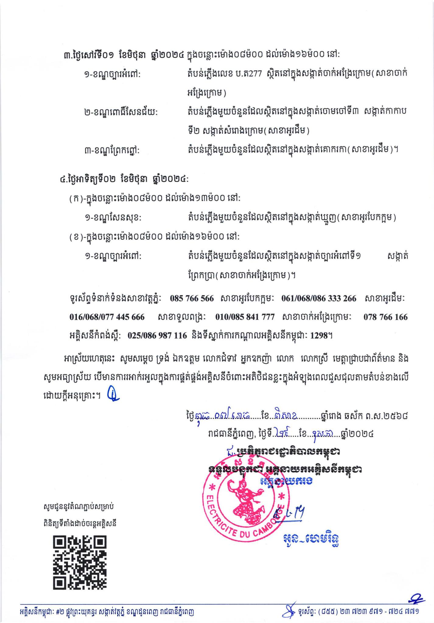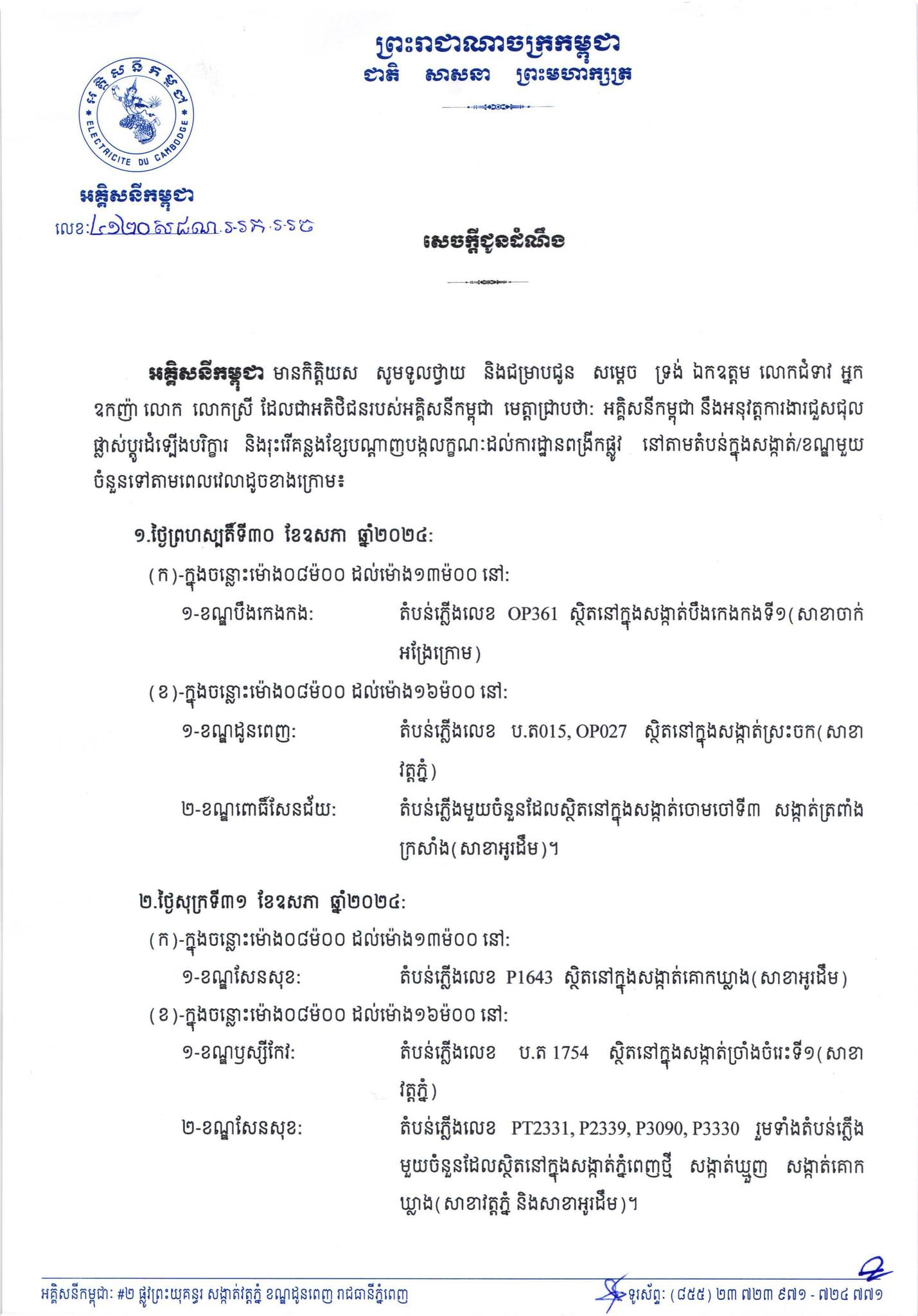 រាជធានីភំ្នពេញ៖ នៅថ្ងៃពុធ ៧រោច ខែពិសាខ ឆ្នាំរោង ឆស័ក ព.ស.២៥៦៨ ត្រូវនឹងថ្ងៃទី២៩ ខែឧសភា ឆ្នាំ២០២៤ យោងតាមការចុះផ្សាយរបស់ អគ្គិសនីកម្ពុជា បានចេញសេចក្ដីជូនដំណឹង ស្តីពីការអនុវត្តការងារជួសជុល ផ្លាស់ប្តូរដំឡើងបរិក្ខារនានា និងរុះរើគន្លងខ្សែបណ្តាញអគ្គិសនីរបស់អគ្គិសនីកម្ពុជា ដើម្បីបង្កលក្ខណៈងាយស្រួលដល់ការដ្ឋានពង្រីកផ្លូវ នៅថ្ងៃទី២៩ ខែឧសភា ឆ្នាំ២០២៤ ដល់ថ្ងៃទី០២ ខែមិថុនា ឆ្នាំ២០២៤ នៅតំបន់មួយចំនួនទៅតាមពេលវេលា និងទីកន្លែងដូចសេចក្តីជូនដំណឹងលម្អិតខាងក្រោម។
