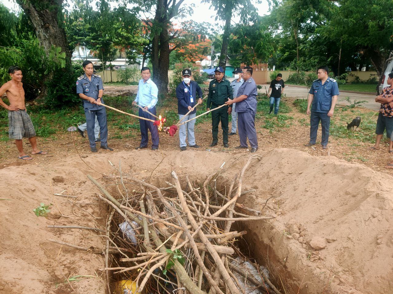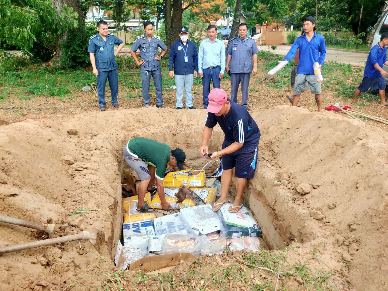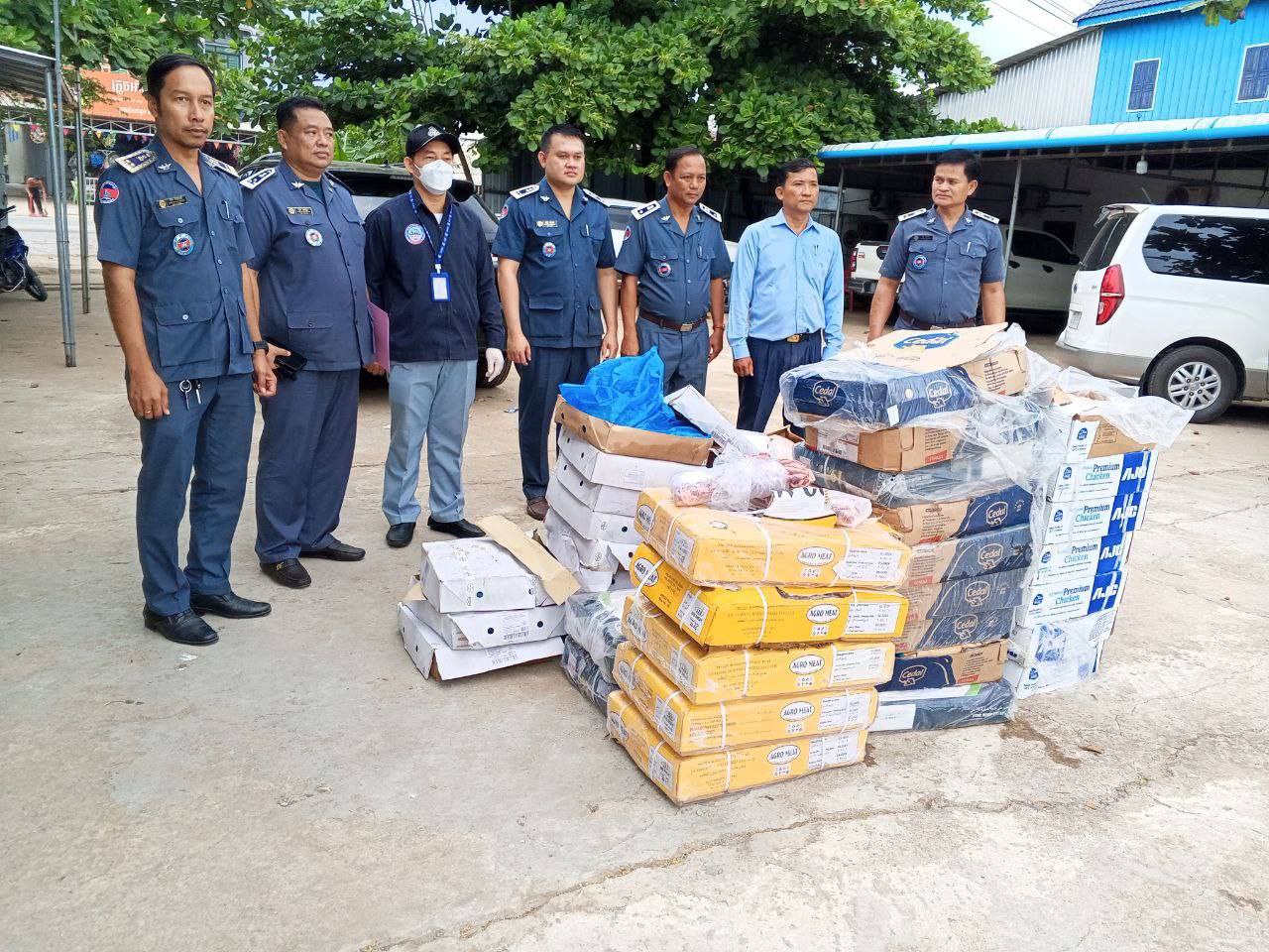 សាច់បង្កកចំនួន ៨៧៧គីឡូក្រាម លាក់បង្កប់ក្នុងបន្លែ ដឹកតាមមាត់ច្រកជ្រៃធំ ខេត្តកណ្តាល ត្រូវបានមន្ត្រីជំនាញដុតកម្ទេចចោល