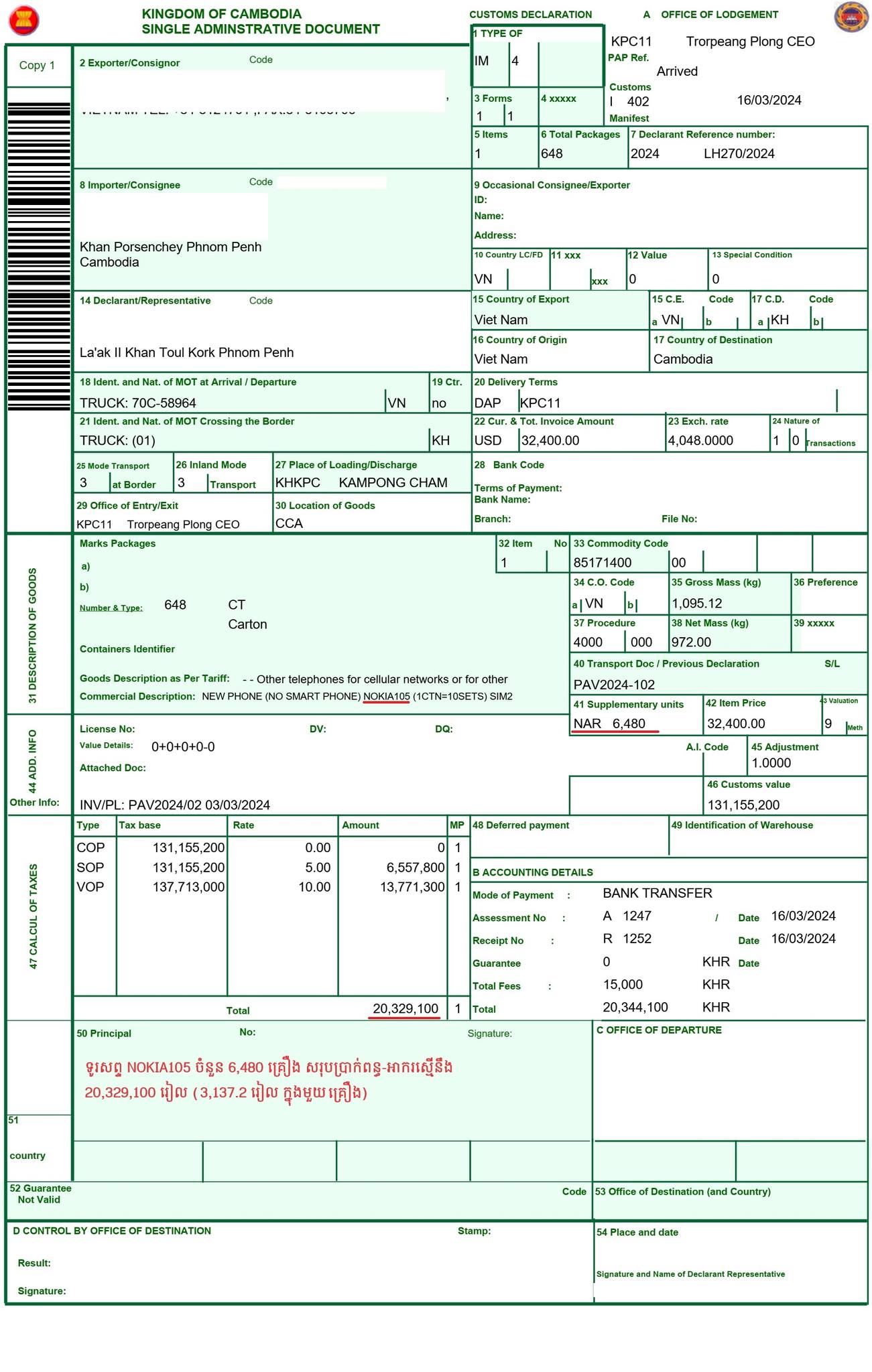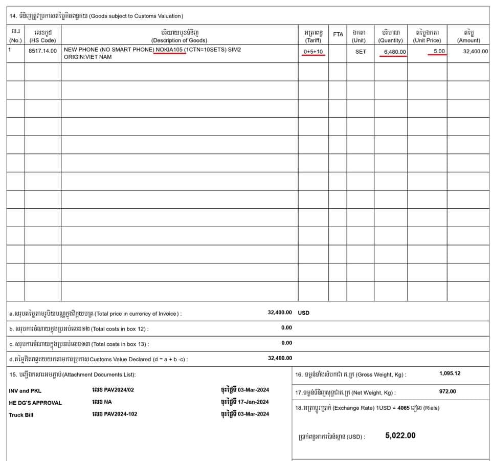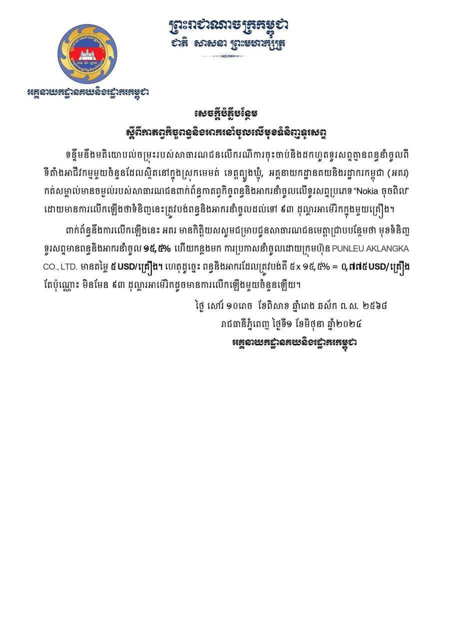 អគ្គនាយកដ្ឋានគយ បំភ្លឺបន្ថែមពាក់ព័ន្ធតម្លៃទូរសព្ទ “Nokia ចុចពិល” ត្រូវបង់ពន្ធ និងអាករនាំចូល មិនមែន ៩៣ដុល្លារទេ