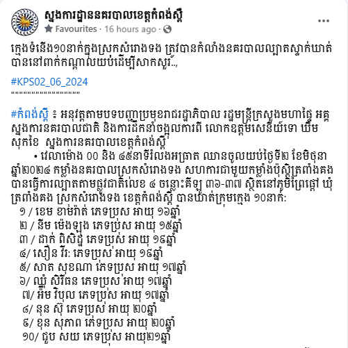 ខេត្តកំពង់ស្ពឺ៖ យោងតាមការចុះផ្សាយរបស់ ស្នងការដ្ឋាននគរបាលខេត្តកំពង់ស្ពឺ បានឱ្យដឹងថា ដោយអនុវត្តតាមបទបញ្ជាប្រមុខរាជរដ្ឋាភិបាល រដ្ឋមន្ត្រីក្រសួងមហាផ្ទៃ អគ្គស្នងការនគរបាលជាតិ និងការដឹកនាំចង្អុលពីលោកឧត្ដមសេនីយ៍ទោ ឃឹម សុកខៃ ស្នងការនគរបាលខេត្តកំពង់ស្ពឺ នៅវេលាម៉ោង ០០ និង ៤៥នាទីរំលងអធ្រាត្រ ឈានចូលយប់ថ្ងៃទី០២ ខែមិថុនា ឆ្នាំ២០២៤ កម្លាំងនគរបាលស្រុកសំរោងទង សហការជាមួយកម្លាំងប៉ុស្ដិ៍ត្រពាំងគង បានធ្វើការល្បាតតាមផ្លូវជាតិលេខ៤ ចន្លោះគីឡូ ៣៦-៣៧ ស្ថិតនៅភូមិព្រៃផ្ដៅ ឃុំត្រពាំងគង ស្រុកសំរោងទង ខេត្តកំពង់ស្ពឺ បានឃាត់ក្រុមក្មេង ១០នាក់រួមមាន៖