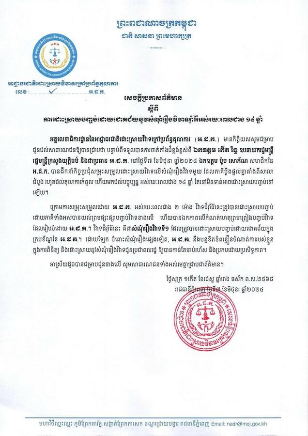 រាជធានីភ្នពេញ៖ នៅថ្ងៃទី០៨ ខែមិថុនា ឆ្នាំ២០២៤ យោងតាមការចុះផ្សាយរបស់ ក្រសួងព័ត៌មាន បានឱ្យដឹងថា អគ្គលេខាធិការដ្ឋាននៃអាជ្ញាធរជាតិដោះស្រាយវិវាទក្រៅប្រព័ន្ធតុលាការ (អ.ជ.ក.) មានកិត្តិយសសូមជម្រាប ជូនដល់សាធារណជនឱ្យបានជ្រាបថា បន្ទាប់ពីទទួលបានការចាត់តាំងដ៏ខ្ពង់ខ្ពស់ពី ឯកឧត្តម កើត រិទ្ធ ឧបនាយករដ្ឋមន្ត្រី រដ្ឋមន្ត្រីក្រសួងយុត្តិធម៌ និងជាប្រធាន អ.ជ.ក. នៅថ្ងៃទី៧ ខែមិថុនា ឆ្នាំ២០២៤ ឯកឧត្តម ប៉ូច សោភ័ណ សមាជិកនៃ អ.ដ.ក. បានដឹកនាំកិច្ចប្រជុំសម្រុះសម្រួលដោះស្រាយវិវាទលើសំណុំរឿងវិវាទមួយ ដែលភាគីប្តឹងផ្តល់គ្នាតាំងពីសាលា ដំបូង រហូតដល់តុលាការកំពូល ហើយមកដល់បច្ចុប្បន្ន អស់រយៈពេលជាង ១៤ ឆ្នាំ តែនៅមិនទាន់អាចដោះស្រាយបញ្ចប់នៅ ឡើយ។