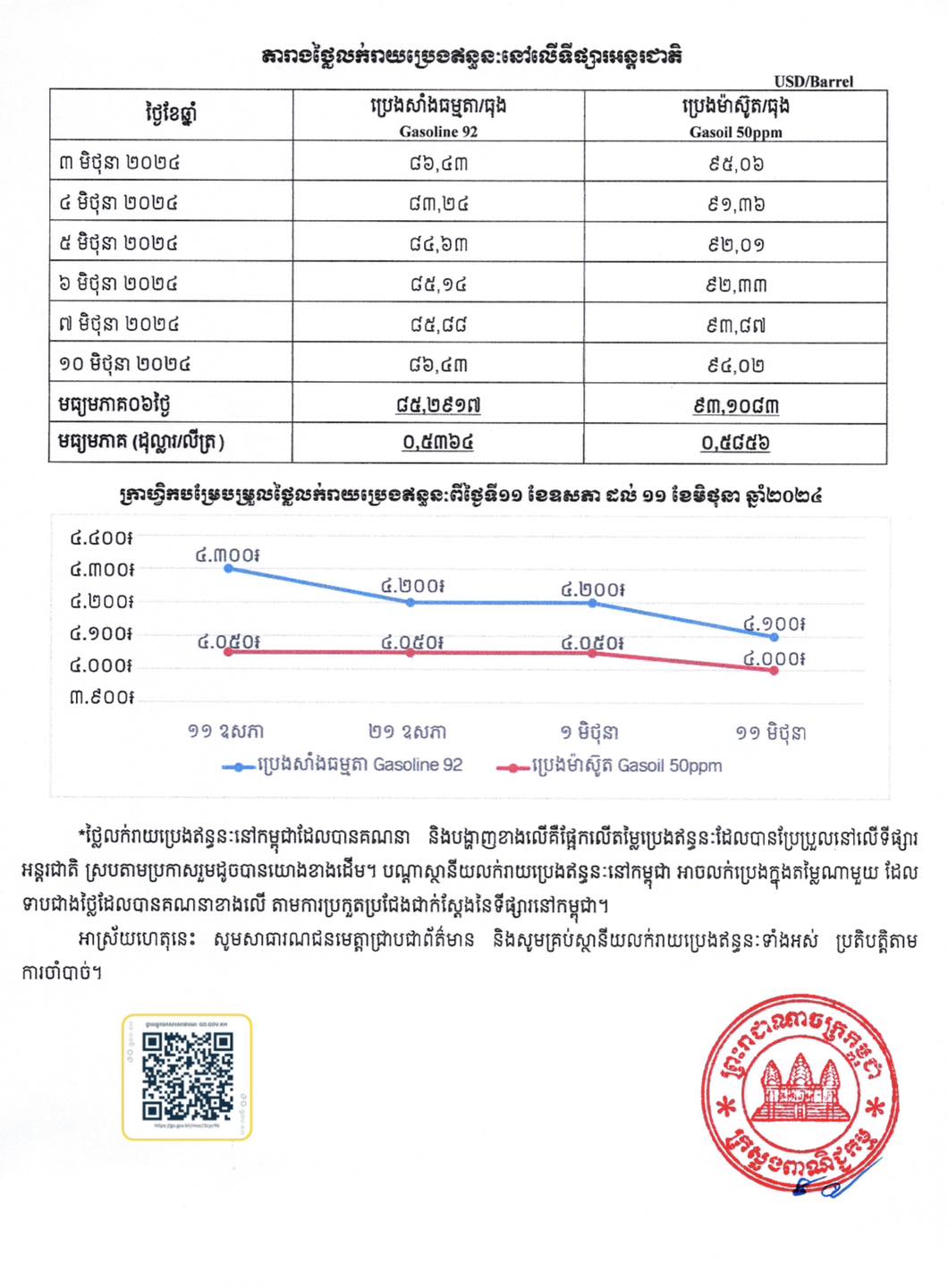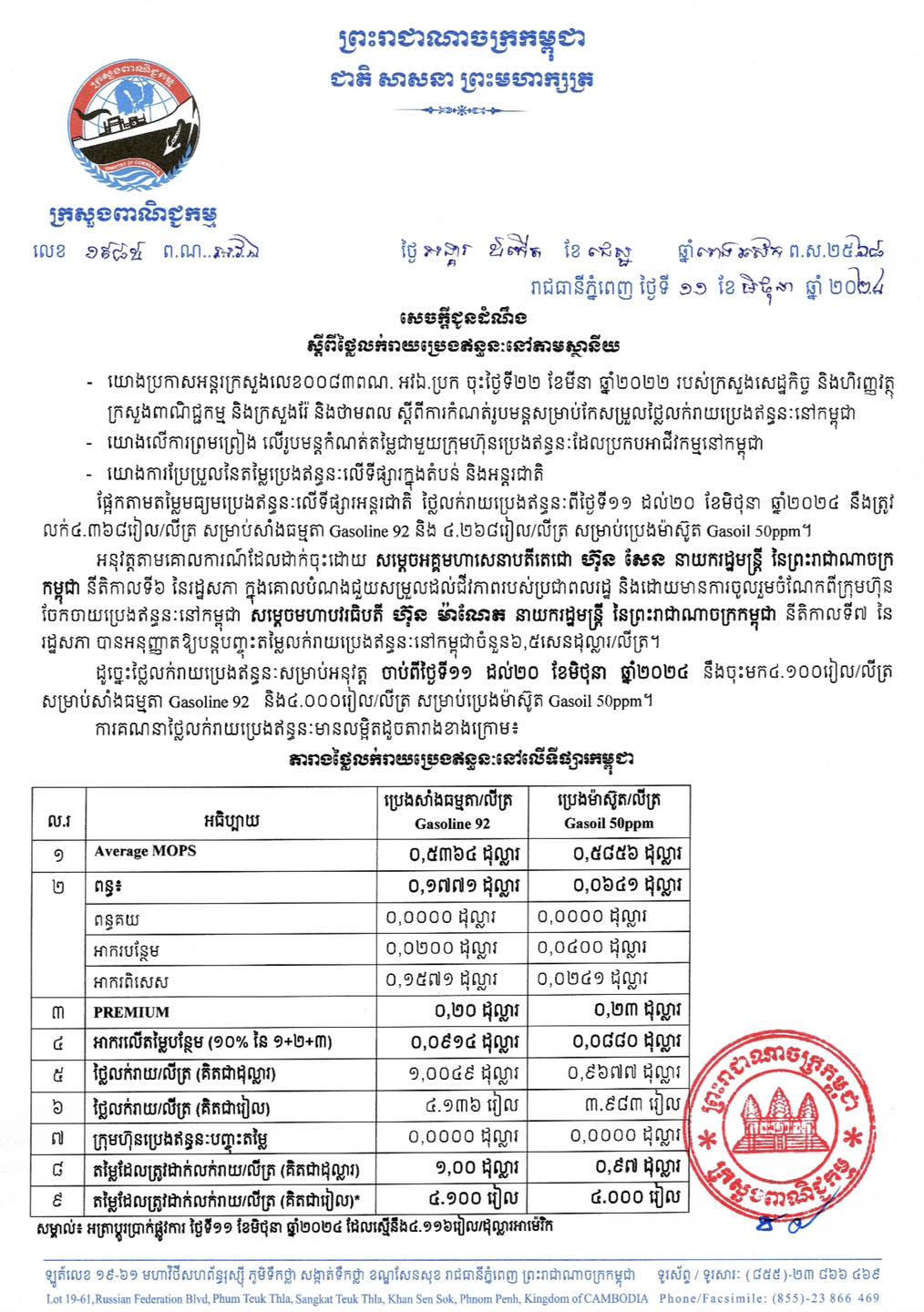រាជធានីភ្នំពេញ៖ នៅថ្ងៃទី១១ ខែមិថុនា ឆ្នាំ២០២៤ យោងតាមការចុះផ្សាយរបស់ ក្រសួងពាណិជ្ជកម្ម បានចេញសេចក្តីជូនដំណឹង ប្រកាសពីតម្លៃលក់រាយប្រេងឥន្ធនៈ នៅតាមស្ថានីយនានាដោយចាប់ពីថ្ងៃទី១១ ដល់ថ្ងៃទី២០ ខែមិថុនា ឆ្នាំ២០២៤ ត្រូវលក់សាំងធម្មតាតម្លៃ ៤,១០០រៀល និងម៉ាស៊ូតត្រូវលក់ ៤,០០០រៀល ក្នុង១លីត្រ។