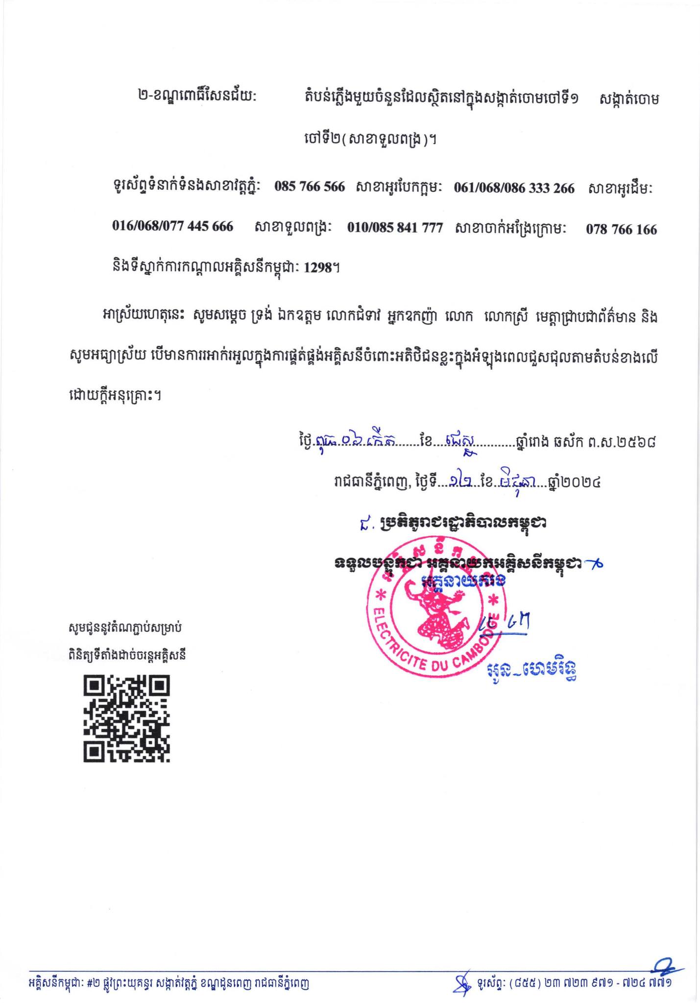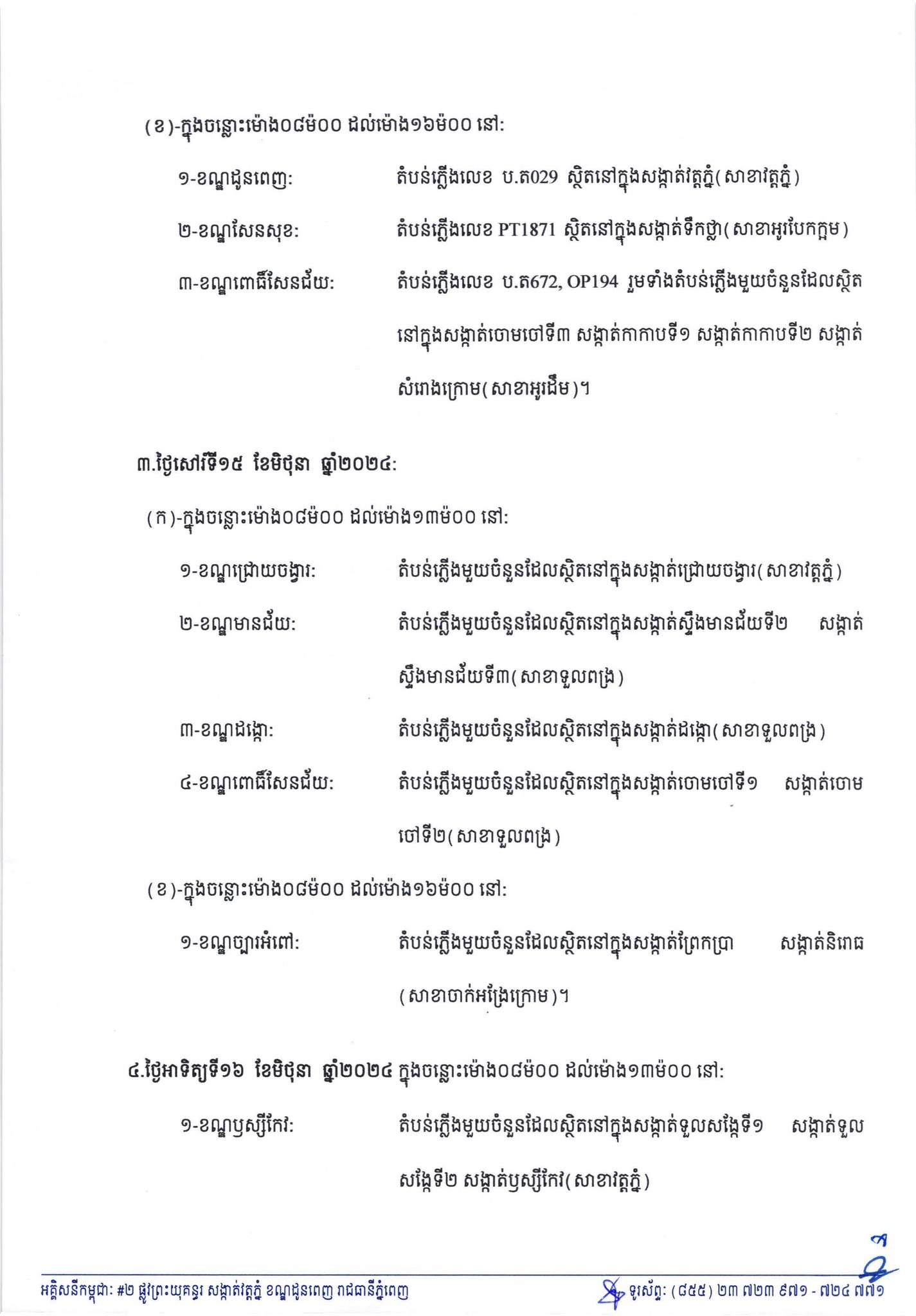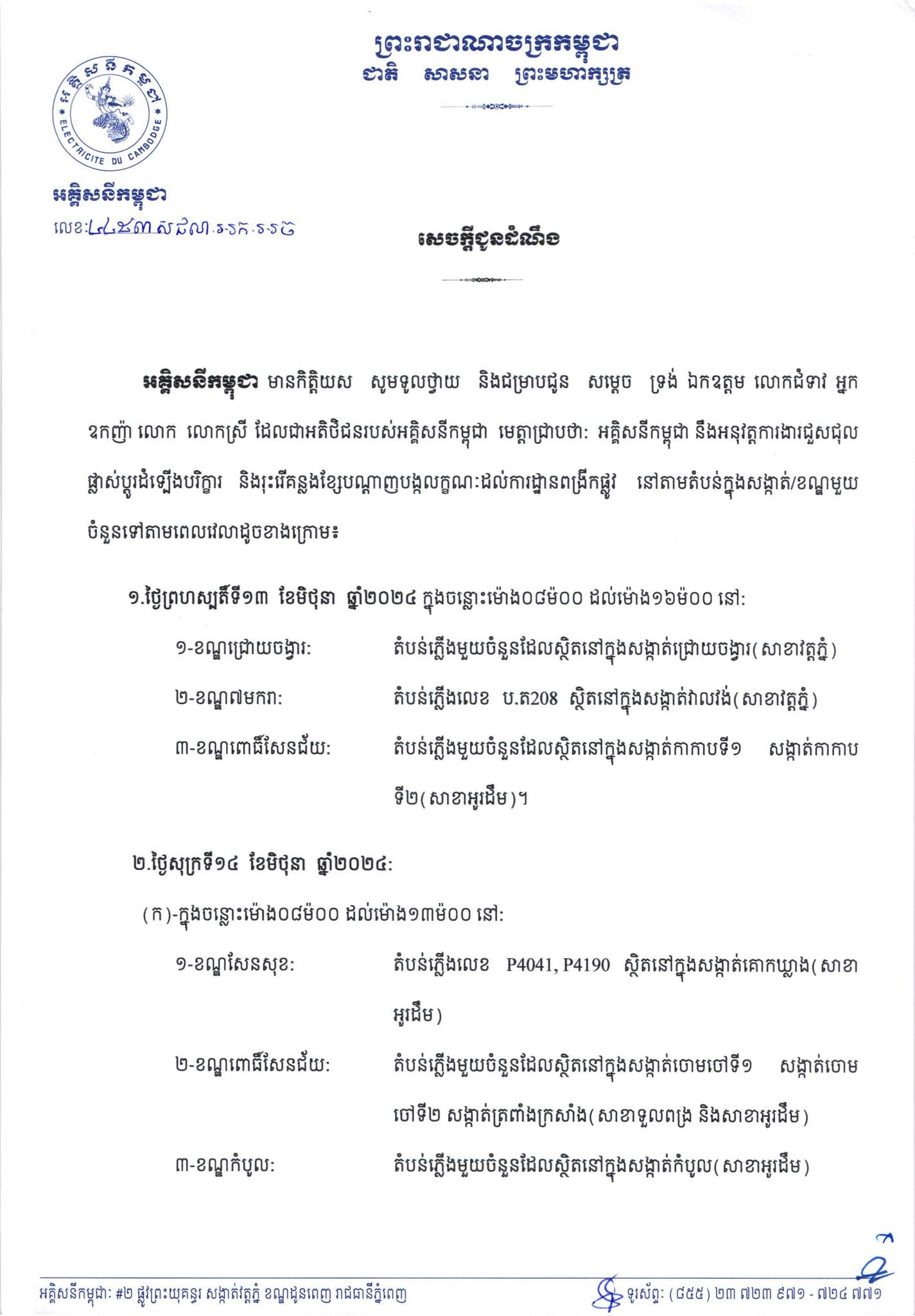 រាជធានីភំ្នពេញ៖ នៅថ្ងៃពុធ ៦កើត ខែជេស្ឋ ឆ្នាំរោង ឆស័ក ព.ស.២៥៦៨ ត្រូវនឹងថ្ងៃទី១២ ខែមិថុនា ឆ្នាំ២០២៤​ យោងតាមការចុះផ្សាយរបស់ អគ្គិសនីកម្ពុជា បានចេញសេចក្ដីជូនដំណឹង ពីការអនុវត្តការងារជួសជុល ផ្លាស់ប្តូរដំឡើងបរិក្ខារនានា និងរុះរើគន្លងខ្សែបណ្តាញអគ្គិសនីរបស់អគ្គិសនីកម្ពុជា ដើម្បីបង្កលក្ខណៈងាយស្រួលដល់ការដ្ឋានពង្រីកផ្លូវ នៅថ្ងៃទី១៣ ខែមិថុនា ឆ្នាំ២០២៤ ដល់ថ្ងៃទី១៦ ខែមិថុនា ឆ្នាំ២០២៤ នៅតំបន់មួយចំនួនទៅតាមពេលវេលា និងទីកន្លែងដូចសេចក្តីជូនដំណឹងលម្អិតខាងក្រោម។