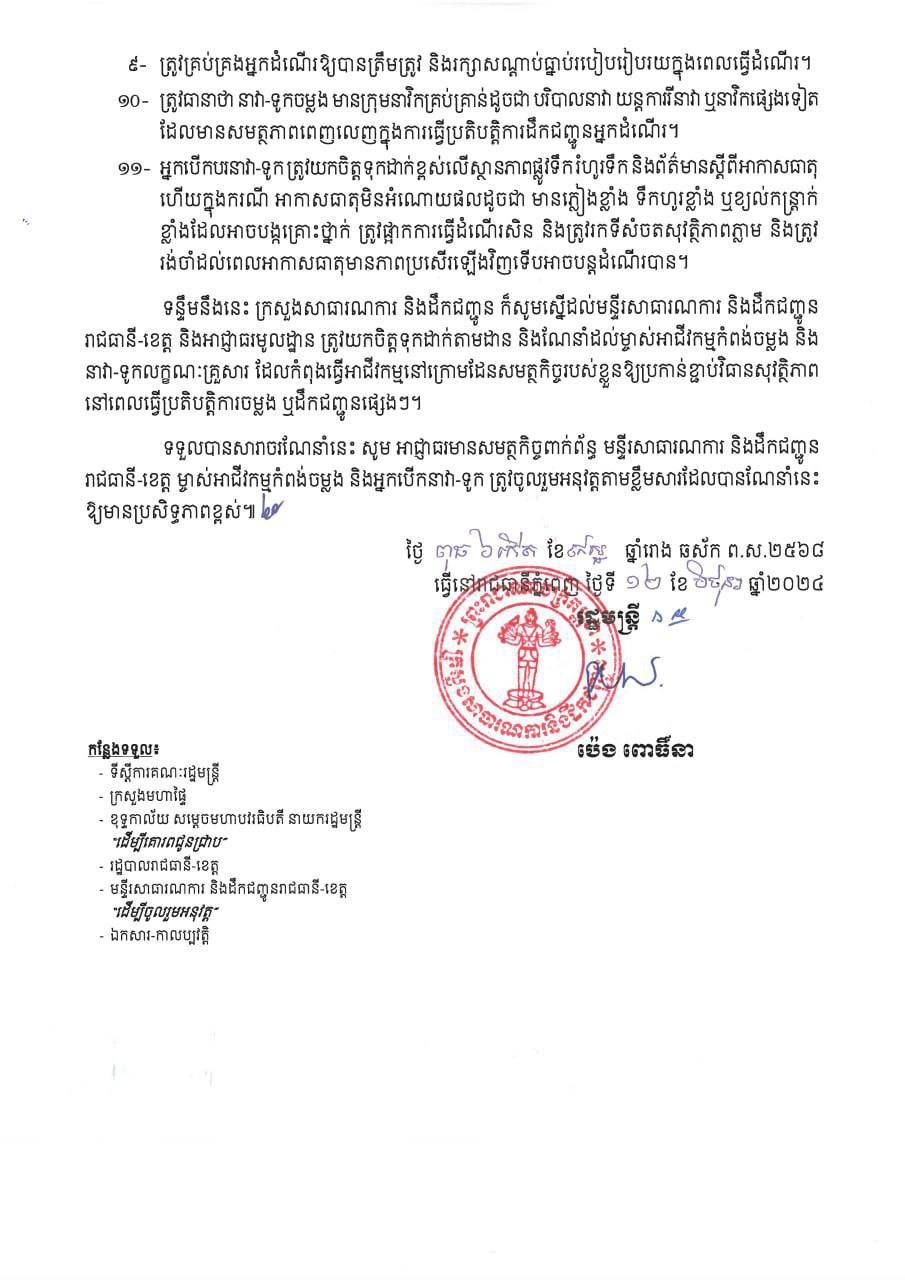 ដោយអនុលោមតាមបទប្បញ្ញត្តិនៃច្បាប់ស្តីពីការដឹកជញ្ជូនតាមផ្លូវទឹកនៃព្រះរាជាណាចក្រកម្ពុជា ឆ្លើយតបនឹងស្ថានភាពដែលអាចកើតមានជាយថាហេតុនូវគ្រោះថ្នាក់ក្នុងការធ្វើដំណើរតាមនាវា ឬទូក ជាពិសេសនៅក្នុងរដូវវស្សាដែលស្ថានភាពអាកាសធាតុមានការប្រែប្រួល និងតែងតែកើតមានជាញឹកញាប់នូវព្យុះ ភ្លៀង ខ្យល់កន្ត្រាក់ និងចរន្តទឹកហូរខ្លាំង ក្រសួងសាធារណការ និងដឹកជញ្ជូន បានចេញសារាចរណែនាំ ១១ចំណុច ស្តីពីវិធានការពង្រឹងការរក្សាសុវត្ថិភាពនាវា-ទូកចម្លងដឹកអ្នកដំណើរ។