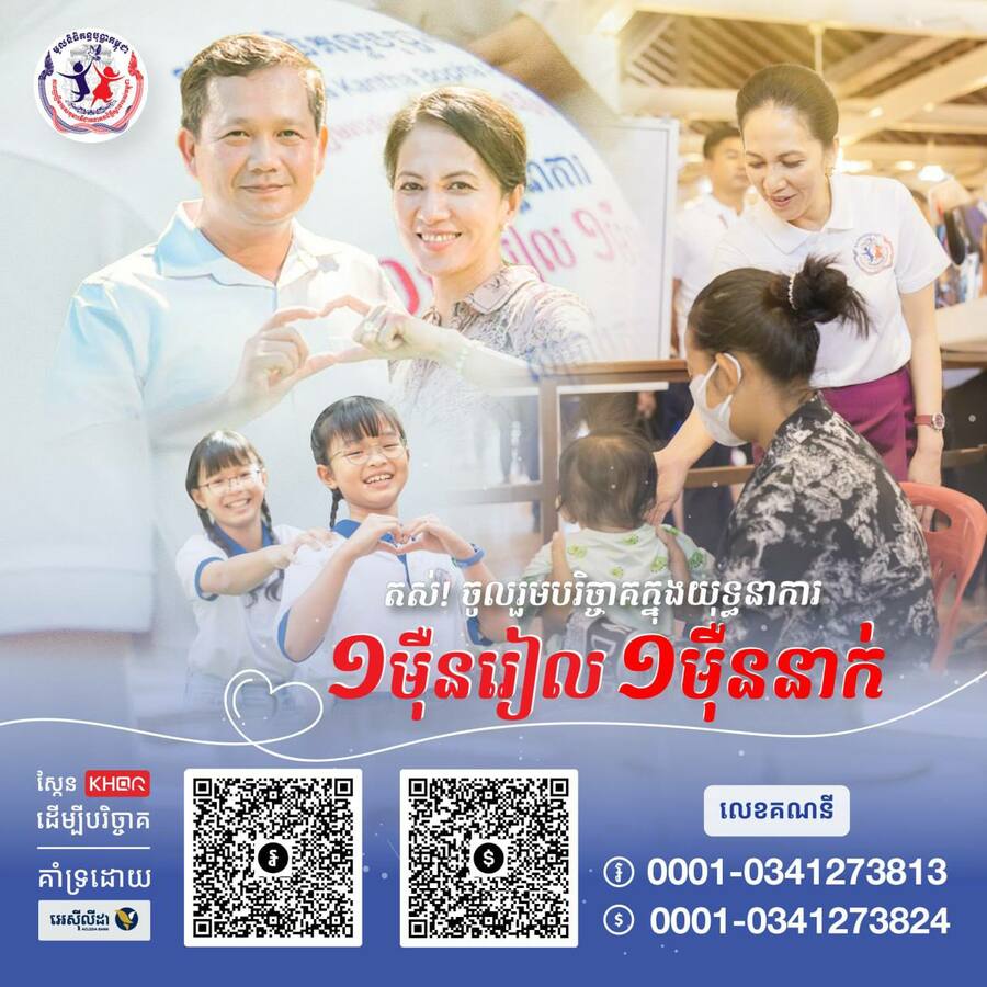 សូមបញ្ជាក់ជូនថា យុទ្ធនាការ “១ម៉ឺនរៀល ១ម៉ឺននាក់” ឆ្នាំ២០២៤នេះ មានរយៈពេលពេញ ១ខែ គឺពីថ្ងៃទី១ ដល់ថ្ងៃទី៣០ ខែមិថុនា ឆ្នាំ២០២៤។ ក្នុងន័យនេះ សប្បុរសជនដែលមានបំណងចូលរួមនាំភាពញញឹមដល់ទារក និងកុមារដែលជាអនាគតដ៏ភ្លឺស្វាងរបស់កម្ពុជា សូមជួយផ្សព្វផ្សាយបន្តអំពីយុទ្ធនាការនេះតាមបណ្ដាញសង្គមរៀងៗខ្លួន និងចូលរួមបរិច្ចាគតាមរយៈការស្កែន QR Code ឬតាមរយៈលេខគណនី ដូចមានក្នុងរូបខាងក្រោម។