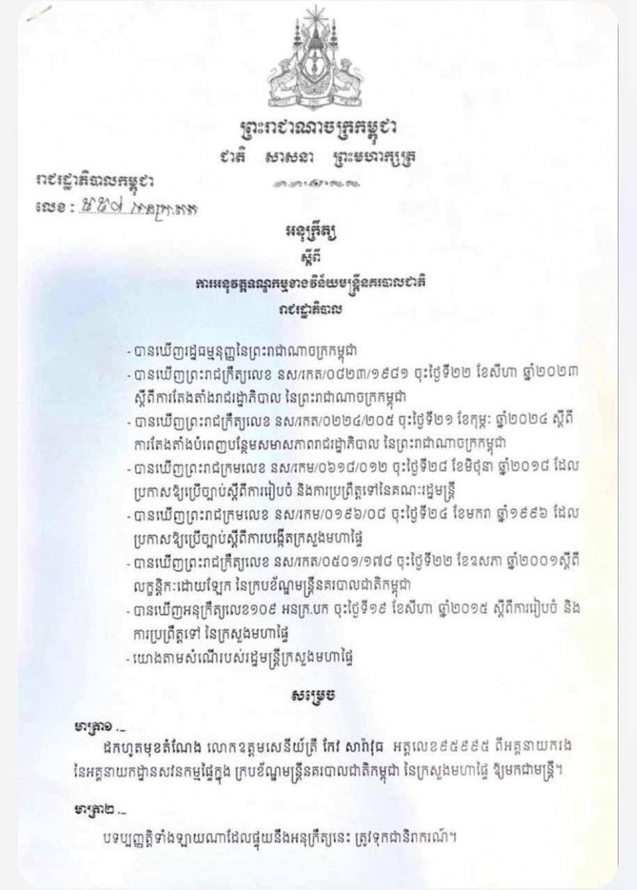 រាជធានីភ្នំពេញ៖ នៅថ្ងៃទី១៥ ខែមិថុនា ឆ្នាំ២០២៤ សម្ដេចមហាបវរធិបតី ហ៊ុន ម៉ាណែត នាយករដ្ឋមន្ដ្រីនៃព្រះរាជាណាចក្រកម្ពុជា បានចេញអនុក្រឹត្យដកតំណែង ឧត្តមសេនីយ៍ត្រី កែវ សារ៉ាវុធ អគ្គនាយករងសវនកម្មផ្ទៃក្នុង ក្របខ័ណ្ឌមន្ដ្រីនគរបាលជាតិកម្ពុជា ឲ្យមកជាមន្ដ្រី។
