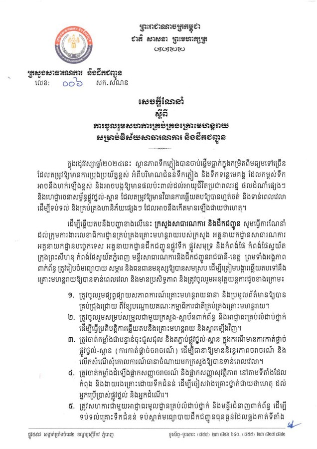 រាជធានីភ្នំពេញ៖ នៅថ្ងៃទី១៤ ខែមិថុនា ឆ្នាំ២០២៤ យោងតាមការចុះផ្សាយរបស់ ក្រសួងសាធារណការ និងដឹកជញ្ជូន បានចេញសេចក្ដីណែនាំស្ដីពី ការចូលរួមសហការគ្រប់គ្រងគ្រោះមហន្តរាយសម្រាប់វិស័យសាធារណការ និងដឹកជញ្ជូន។