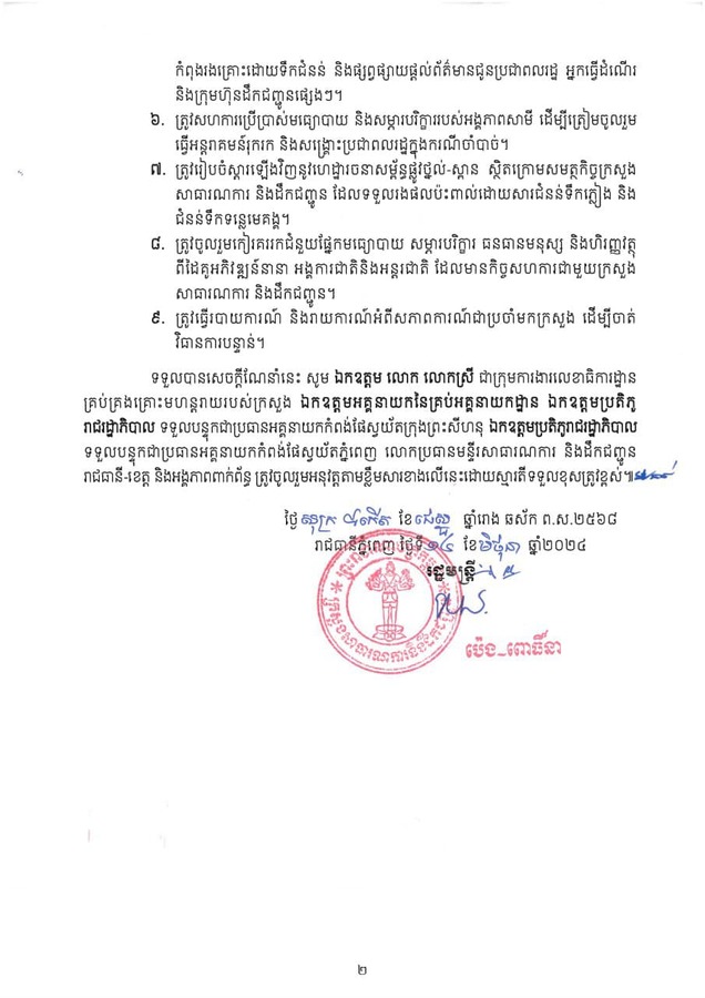 ដើម្បីឆ្លើយតបនឹងបញ្ហាខាងលើនេះ ក្រសួងសាធារណការ និងដឹកជញ្ជូន សូមធ្វើការណែនាំ ដល់ក្រុមការងារលេខាធិការដ្ឋានគ្រប់គ្រងគ្រោះមហន្តរាយរបស់ក្រសួង អគ្គនាយកដ្ឋានសាធារណការ អគ្គនាយកដ្ឋានបច្ចេកទេស អគ្គនាយកដ្ឋានដឹកជញ្ជូនផ្លូវទឹក ផ្លូវសមុទ្រ និងកំពង់ផែ កំពង់ផែស្វយ័ត ក្រុងព្រះសីហនុ កំពង់ផែស្វយ័តភ្នំពេញ មន្ទីរសាធារណការនិងដឹកជញ្ជូនរាជធានី-ខេត្ត ព្រមទាំងអង្គភាព ពាក់ព័ន្ធ ត្រូវរៀបចំមធ្យោបាយ សម្ភារ និងធនធានមនុស្សឱ្យបានសមស្រប ដើម្បីត្រៀមបង្ការឆ្លើយតបទៅនឹងគ្រោះមហន្តរាយឱ្យបានទាន់ពេលវេលា និងមានប្រសិទ្ធភាព។