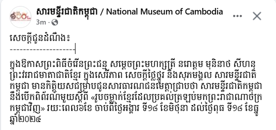 សារមន្ទីរជាតិកម្ពុជា បានចេញសេចក្តីជូនដំណឹងដល់សាធារណជន ឱ្យបានជ្រាបថា ក្នុងឱកាសព្រះពិធីចំរើនព្រះជន្ម សម្តេចព្រះមហាក្សត្រី នរោត្តម មុនិនាថ សីហនុ ព្រះវររាជមាតាជាតិខ្មែរ ក្នុងសេរីភាព សេចក្តីថ្លៃថ្នូរ និងសុភមង្គល សារមន្ទីរជាតិកម្ពុជា មានកិត្តិយសូមជម្រាបជូនថា សារមន្ទីរជាតិកម្ពុជានឹងបើកពិព័រណ៍មួយស្តីពី «រូបចម្លាក់ខ្មែរដែលប្រគល់ត្រឡប់មកព្រះរាជាណាចក្រកម្ពុជាវិញ» រយៈពេល៦ខែ ចាប់ពីថ្ងៃអង្គារ ទី១៨ ខែមិថុនា ដល់ថ្ងៃពុធ ទី១៨ ខែធ្នូ ឆ្នាំ២០២៤ ៕