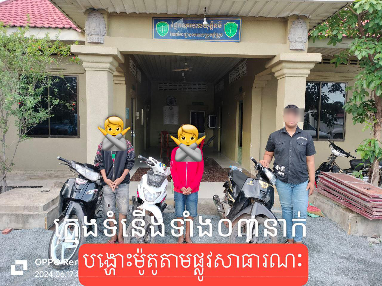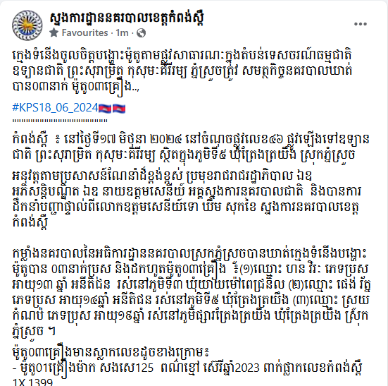 ខេត្តកំពង់ស្ពឺ៖ យោងតាមការចុះផ្សាយរបស់ ស្នងការដ្ឋាននគរបាលខេត្តកំពង់ស្ពឺ បានឱ្យដឹងថា នៅថ្ងៃទី១៧ ខែមិថុនា ឆ្នាំ២០២៤ នៅចំណុចផ្លូវលេខ៤៦ ផ្លូវឡើងទៅឧទ្យានជាតិ ព្រះសុរាម្រិត កុសុមៈគិរីរម្យ ស្ថិតក្នុងភូមិទី៥ ឃុំត្រែងត្រយឹង ស្រុកភ្នំស្រួច ដោយអនុវត្តតាមប្រសាសន៍ណែនាំដ៏ខ្ពង់ខ្ពស់ ប្រមុខរាជរាជរដ្ឋាភិបាល ឯកឧត្តម អភិសន្ដិបណ្ឌិត ឯកឧត្តម នាយឧត្ដមសេនីយ៍ អគ្គស្នងការនគរបាលជាតិ និងបានការដឹកនាំបញ្ជាផ្ទាល់ពីលោកឧត្ដមសេនីយ៍ទោ ឃឹម សុកខៃ ស្នងការនគរបាលខេត្តកំពង់ស្ពឺ កម្លាំងនគរបាលនៃអធិការដ្ឋាននគរបាលស្រុកភ្នំស្រួច បានឃាត់ក្មេងទំនើងបង្ហោះម៉ូតូបាន ០៣នាក់ និងដកហូតម៉ូតូ០៣គ្រឿងរួមមាន៖