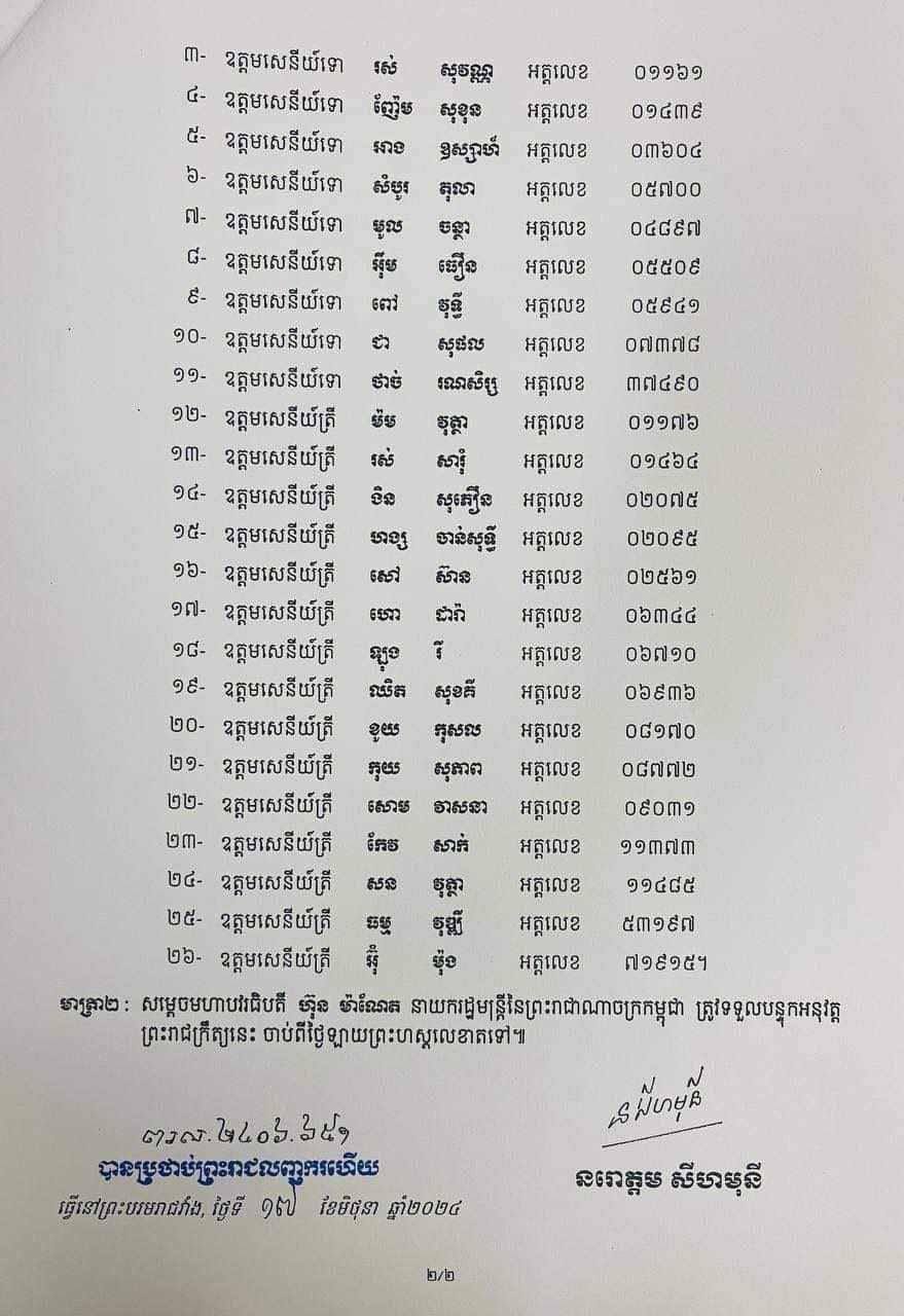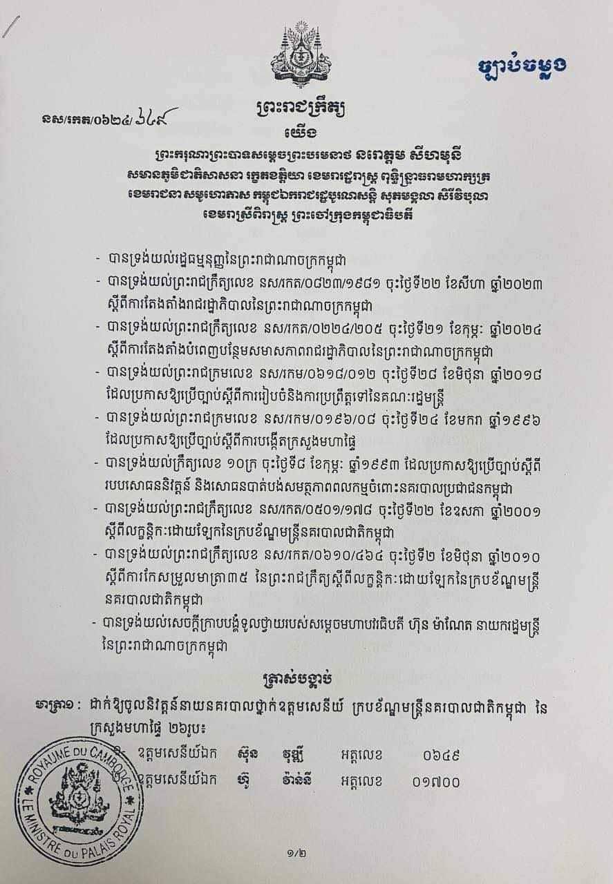 ព្រះមហាក្សត្រ ត្រាស់បង្គាប់ ដាក់ឱ្យចូលនិវត្ដន៍នាយនគរបាលថ្នាក់ឧត្ដមសេនីយ៍ ក្របខ័ណ្ឌមន្ដ្រីនគរបាលជាតិកម្ពុជាចំនួន ២៦រូប
