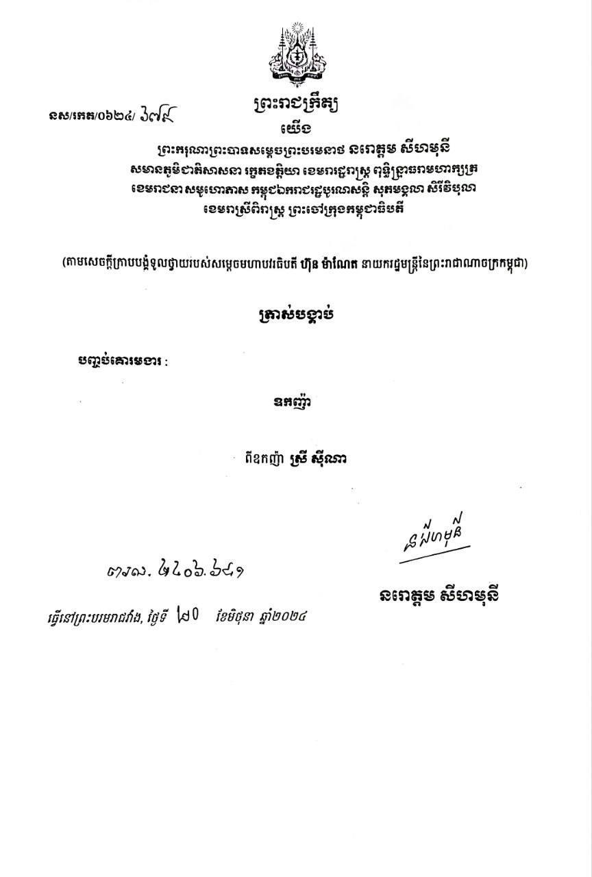 ព្រះមហាក្សត្រ ចេញព្រះរាជក្រឹត្យបញ្ចប់គោរមងារ «ឧកញ៉ា ស្រី ស៊ីណា» បន្ទាប់ពីកើតឡើងករណីបា.ញ់ជនរងគ្រោះ ២នាក់គូដណ្ដឹង នៅក្នុងបុរីប៉េងហួតបឹងស្នោរ