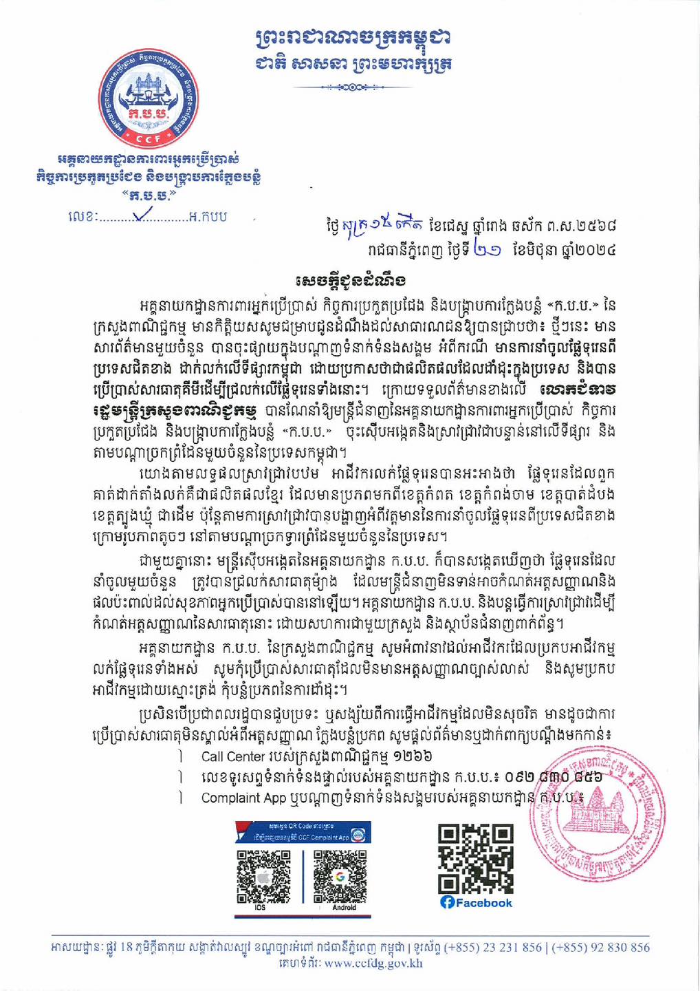 ប្រភព៖ អគ្គ.ការពារអ្នកប្រើប្រាស់ កិច្ចការប្រកួតប្រជែង និងបង្ក្រាបការក្លែងបន្លំ CCF