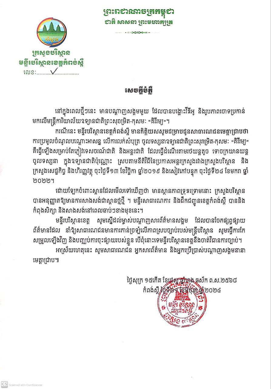 មន្ទីរបរិស្ថានខេត្តកំពង់ស្ពឺ ស្នើដល់បណ្តាញសារព័ត៌មាន ដែលបង្ហោះវីដេអូ និងរូបភាព ចោទប្រកាន់លើមន្ត្រីការិយាល័យឧទ្យានជាតិគិរីរម្យ ត្រូវកែសម្រួលឡើងវិញ