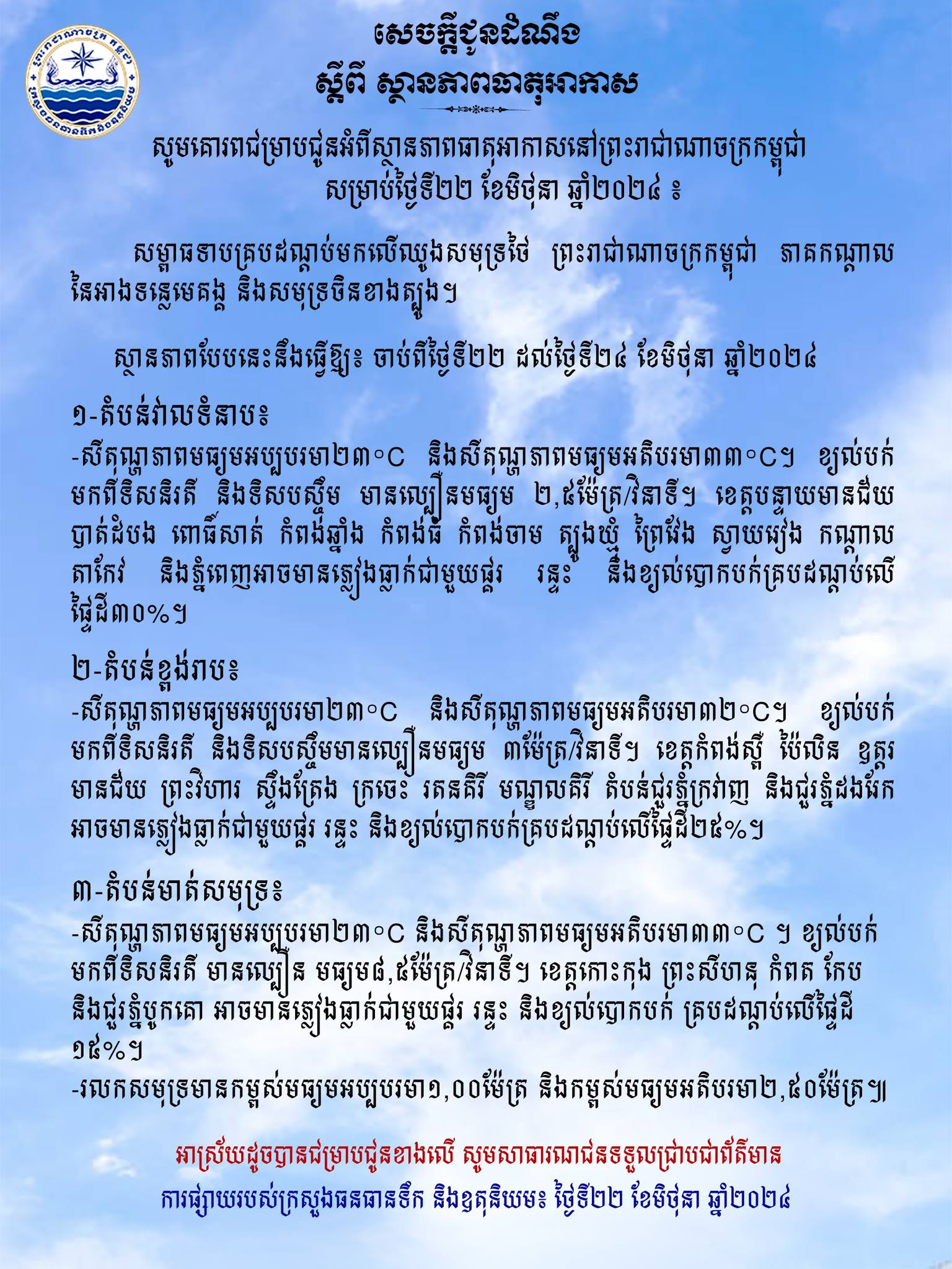ក្រសួងធនធានទឹក បានឱ្យដឹងថា សម្ពាធទាបគ្របដណ្ដប់មកលើឈូងសមុទ្រថៃ ព្រះរាជាណាចក្រកម្ពុជា ភាគកណ្តាល នៃអាងទន្លេមេគង្គ និងសមុទ្រចិនខាងត្បូង។ ស្ថានភាពបែបនេះនឹងធ្វើឱ្យចាប់ពីថ្ងៃទី២២ ដល់ថ្ងៃទី២៤ ខែមិថុនា ឆ្នាំ២០២៤៖