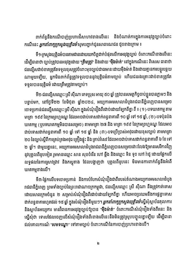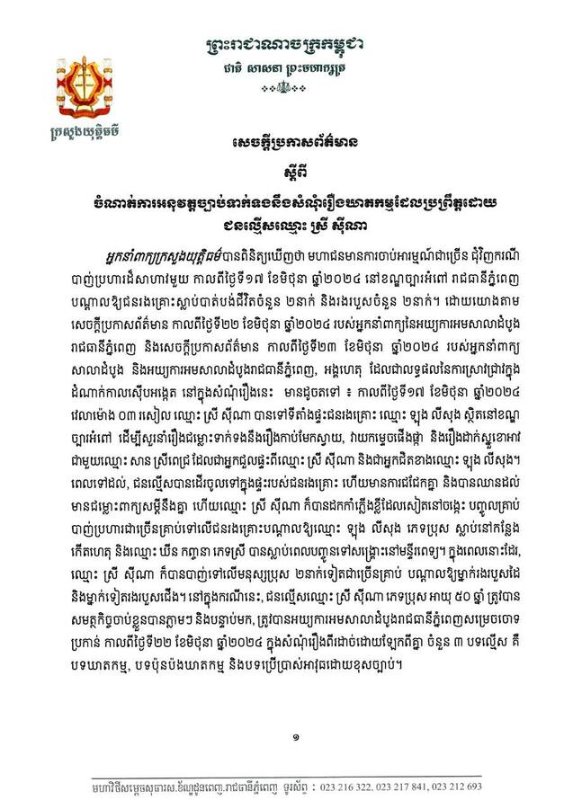 សារក្នុងន័យស្វែងរកយុត្តិធម៌ក្នុងសំណុំរឿងអតីតឧកញ៉ា ស្រី ស៊ីណា ខ្មាន់កាំភ្លើងផ្តាច់ជីវិតគូដណ្ដឹងនៅតែពេលចូលរោងការមួយគូ និងប្រហារឱ្យរបួសធ្ងន់ស្រាលមនុស្សពីរនាក់ផ្សេងទៀត បានបង្ហាញឡើងក្នុងសេចក្តីប្រកាសព័ត៌មានរបស់ក្រសួងយុត្តិធម៌នៅរសៀលថ្ងៃទី២៣ ខែមិថុនា ឆ្នាំ២០២៤នេះ។