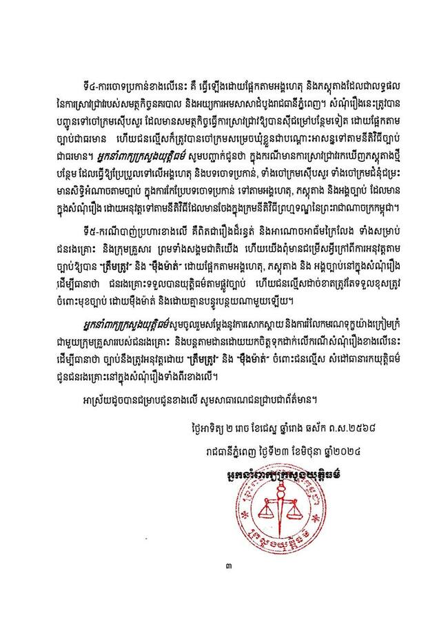 ទី៤-ការចោទប្រកាន់ខាងលើនេះ គឺ ធ្វើឡើងដោយផ្អែកតាមអង្គហេតុ និងភស្តុតាងដែលជាលទ្ធផលនៃការស្រាវជ្រាវរបស់សមត្ថកិច្ចនគរបាល និងអយ្យការអមសាសាដំបូងរាជធានីភ្នំពេញ។ សំណុំរឿងនេះត្រូវបានបញ្ជូនទៅចៅក្រមស៊ើបសួរ ដែលមានសមត្ថកិច្ចធ្វើការស្រាវជ្រាវឱ្យបានស៊ីជម្រៅបន្ថែមទៀត ដោយផ្អែកតាមច្បាប់ជាធរមាន ហើយជនល្មើសក៏ត្រូវបានចៅក្រមសម្រេចឃុំខ្លួនជាបណ្តោះអាសន្នទៅតាមនីតិវិធីច្បាប់ជាធរមាន។
