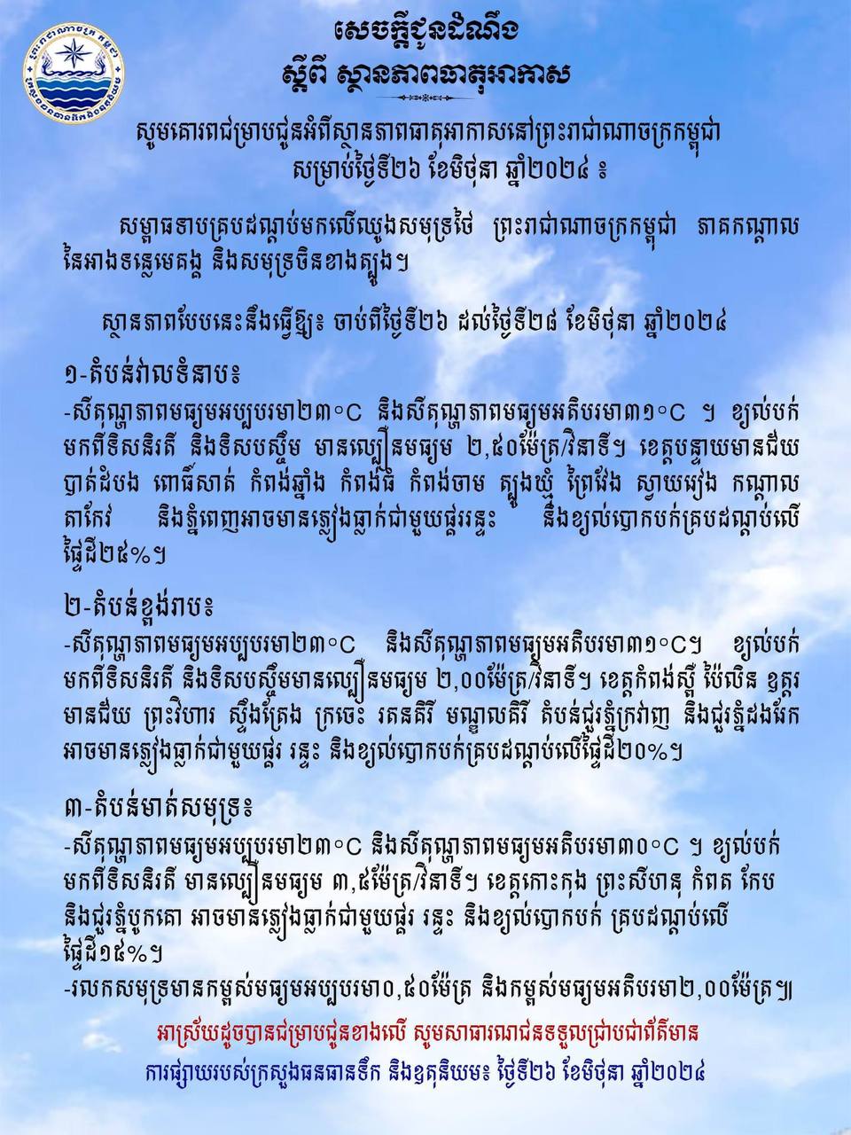រាជធានីភ្នំពេញ៖ នៅថ្ងៃទី២៦ ខែមិថុនា ឆ្នាំ២០២៤ យោងតាមការចុះផ្សាយរបស់ ក្រសួងធនធានទឹក និងឧតុនិយម បានចេញសេចក្ដីជូនដំណឹងអំពីស្ថានភាពធាតុអាកាសនៅព្រះរាជាណាចក្រកម្ពុជា។