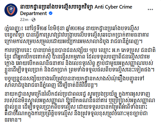 រាជធានីភ្នំពេញ៖ យោងតាមការចុះផ្សាយរបស់ នាយកដ្ឋានប្រឆាំងបទល្មើសបច្ចេកវិទ្យា បានឱ្យដឹងថា នៅថ្ងៃទី២៥ ខែមិថុនា ឆ្នាំ២០២៤ នាយកដ្ឋានប្រឆាំងបទល្មើសបច្ចេកវិទ្យា បានធ្វើការស្រាវជ្រាវបង្រ្កាបលើបទល្មើសឆបោកប្រាក់តាមធនាគារ ក្រោមការសម្របសម្រួលដោយអយ្យការអមសាលាដំបូង រាជធានីភ្នំពេញ។