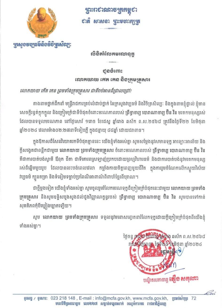 ក្នុងឱកាសដ៏សែនវិយោគរកទីបំផុតគ្មាននេះ យើងខ្ញុំទាំងអស់គ្នា សូមសម្តែងនូវសមានទុក្ខ អាឡោះអាល័យ និង ក្តីសង្វេគជាពន្លឹកជាមួយ លោកយាយ ព្រមទាំងក្រុមគ្រួសារ ចំពោះមរណភាពរបស់ ព្រឹទ្ធាចារ្យ បោរាណាចារ្យ ប៊ិន វិន គឺជាការបាត់បង់ស្វាមី ឪពុក ជីតា ជាទីគោរពស្រឡាញ់ប្រកបដោយព្រហ្មវិហារធម៌ និងជាការបាត់បង់នូវមរតកមនុស្ស រស់ដ៏ឆ្នើមមួយរូប ដែលបានលះបង់ពេលវេលា កម្លាំងកាយចិត្តពេញមួយជីវិត ក្នុងការរួមចំណែកលើកស្ទួយវិស័យ វប្បធម៌ ក្បួនតម្រា និងទំនៀមទម្លាប់ប្រពៃណីអាពាណ៍ពិពាហ៍ខ្មែរពីបុរាណ ៕
