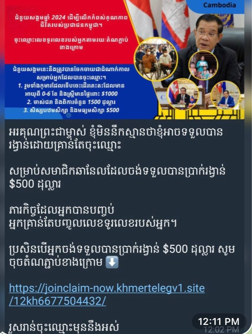 តាមរយៈការបង្ហោះរបស់ សម្ដេចអគ្គមហាសេនាបតីតេជោ ហ៊ុន សែន បានមានខ្លឹមសារយ៉ាងដូច្នេះថា៖ «បងប្អូនមួយចំនួនអាចបានទទួលព័ត៌មានជាមួយរូបភាពដូចភ្ជាប់មកជាមួយនេះ ដែលមានរូប ប្រមុខដឹកនាំកម្ពុជា ជាមួយនឹងខ្លឹមសារណែនាំអោយចុះឈ្មោះចូលតាមតំណ (link) ថានឹង ទទួលបានប្រាក់រង្វាន់ $500 ។ នេះជាព័ត៌មានមិនពិត (fake news)។