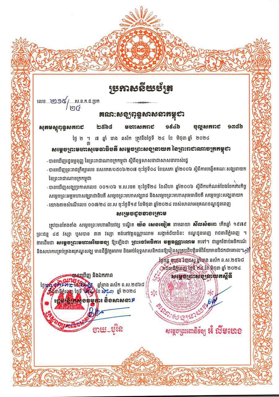រាជធានីភ្នំពេញ៖ នៅថ្ងៃទី២៨ ខែមិថុនា ឆ្នាំ២០២៤ សម្ដេចព្រះមហាអរិយវង្សបណ្ឌិត យ៉ន សេង យៀត នាមឆាយា សីលសំវរោ កើតឆ្នាំ១៩៧៩ ព្រះជន្ម ៤៥វស្សា បួសបាន ៣៣វស្សា គង់នៅវត្តឧណ្ណាលោម សង្កាត់ជ័យជំនះ ខណ្ឌដូនពេញ រាជធានីភ្នំពេញ ត្រូវបានតែងតាំងជា «ព្រះចៅអធិការវត្តឧណ្ណាលោម» បន្តពីសម្ដេចព្រះអគ្គមហាសង្ឃរាជាធិបតី ទេព វង្ស សម្ដេចព្រះមហាសង្ឃរាជ នៃព្រះរាជាណាក្រកម្ពុជា។