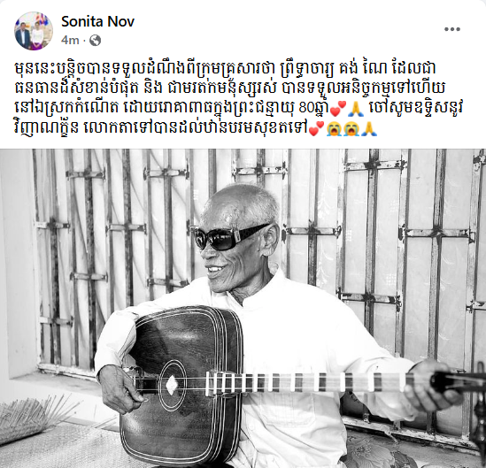 រាជធានីភ្នំពេញ៖ នៅថ្ងៃទី២៨ ខែមិថុនា ឆ្នាំ២០២៤ យោងតាមគណនីហ្វេសប៊ុកផ្ទាល់របស់ តារាសម្ដែងស្រី និងជាពិធិការិនី អ្នកនាង នៅ សូនិតា បានបង្ហោះសារ អំពីដំណឹងមរណភាពរបស់ ព្រឹទ្ធាចារ្យកោសល្យវោហារ គង់ ណៃ ដែលជាសិល្បករចាប៉ីដងវែងដ៏ល្បីល្បាញមួយរូបរបស់កម្ពុជា និងមរតកមនុស្សរស់ បានទទួលអនិច្ចកម្មទៅហើយ នៅឯស្រុកកំណើត ដោយរោគាពាធ។