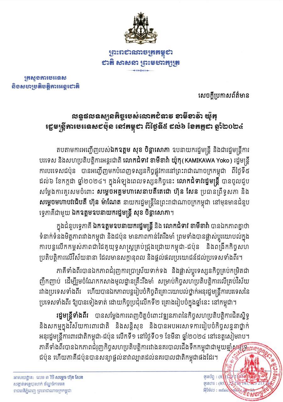 តបតាមការអញ្ជើញរបស់ឯកឧត្ដម សុខ ចិន្ដាសោភា ឧបនាយករដ្ឋមន្ដ្រី និងជារដ្ឋមន្ដ្រីការបរទេស និងសហប្រតិបត្តិការអន្ដរជាតិ លោកជំទាវ ខាមីខាវ៉ា យ៉ូកុ រដ្ឋមន្ដ្រីការបរទេសជប៉ុន បានអញ្ជើញមកបំពេញទស្សនកិច្ចផ្លូវការនៅព្រះរាជាណាចក្រកម្ពុជា ពីថ្ងៃទី៥ ដល់ទី៦ ខែកក្កដា ឆ្នាំ២០២៤។ ក្នុងអំឡុងពេលទស្សនកិច្ចនេះ លោកជំទាវរដ្ឋមន្ដ្រី បានចូលជួបសម្ដែងការគួរសមចំពោះ សម្ដេចអគ្គមហាសេនាបតីតេជោ ហ៊ុន សែន ប្រធានព្រឹទ្ធសភា និងសម្ដេចមហាបវរធិបតី ហ៊ុន ម៉ាណែត នាយករដ្ឋមន្ដ្រីនៃព្រះរាជាណាចក្រកម្ពុជា នៅមុនមានជំនួបទ្វេភាគីជាមួយ ឯកឧត្ដមឧបនាយករដ្ឋមន្ដ្រី សុខ ចិន្ដាសោភា ឧបនាយករដ្ឋមន្ដ្រី។