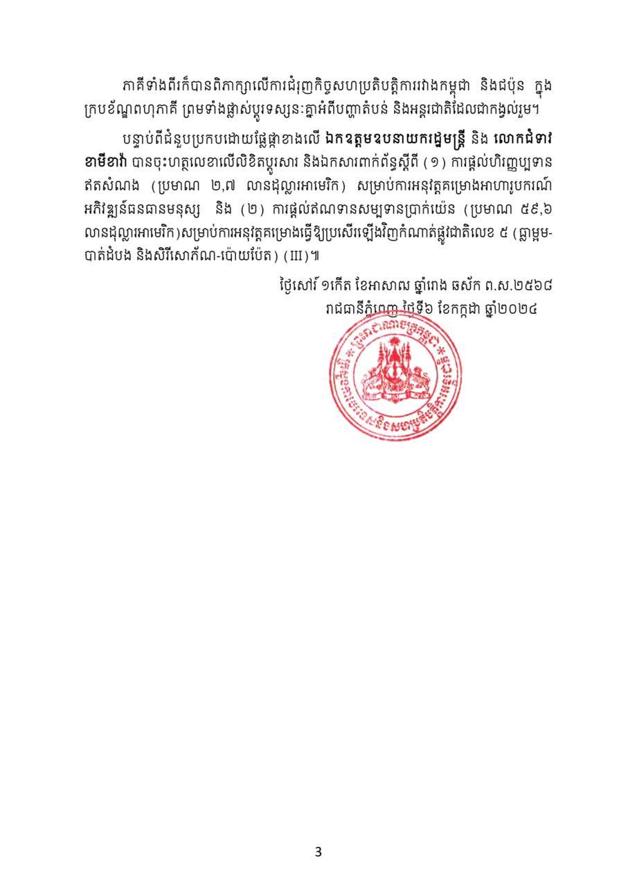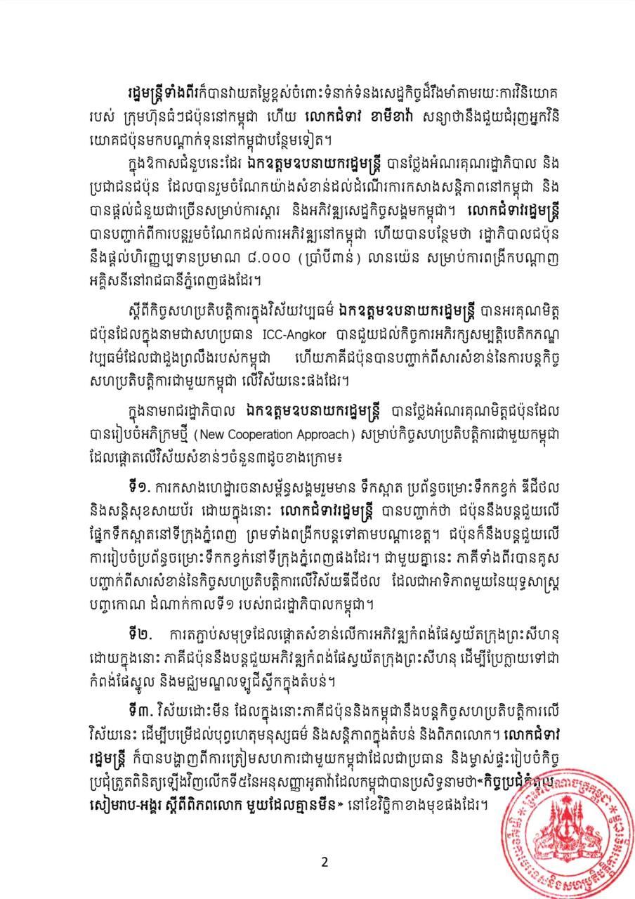 ក្នុងឱកាសជំនួបនេះដែរ ឯកឧត្ដមឧបនាយករដ្ឋមន្ដ្រី បានថ្លែងអំណរគុណរដ្ឋាភិបាល និងប្រជាជនជប៉ុន ដែលបានរួមចំណែកយ៉ាងសំខាន់ដល់ដំណើរការកសាងសន្ដិភាពនៅកម្ពុជា និងបានផ្ដល់ជំនួយជាច្រើនសម្រាប់ការស្ដារ និងអភិវឌ្ឍសេដ្ឋកិច្ចសង្គមកម្ពុជា។ លោកជំទាវរដ្ឋមន្ដ្រី បានបញ្ជាក់ពីការបន្ដរួមចំណែកដល់ការអភិវឌ្ឍនៅកម្ពុជា ហើយបានបន្ថែមថា រដ្ឋាភិបាលជប៉ុន នឹងផ្ដល់ហិរញ្ញប្បទានប្រមាណ ៨.០០០ (ប្រាំបីពាន់) លានយ៉េន សម្រាប់ការពង្រីកបណ្ដាញអគ្គិសនីនៅរាជធានីភ្នំពេញ៕
