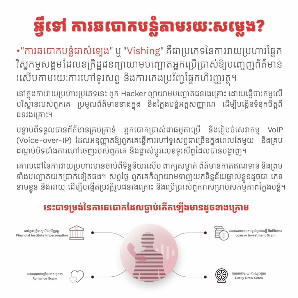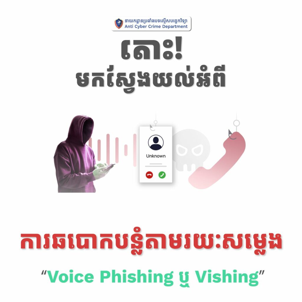 (ភ្នំពេញ)៖ នាយកដ្ឋានប្រឆាំងបទល្មើសបច្ចេកវិទ្យា នៅព្រឹកថ្ងៃទី០៨ ខែកក្កដានេះបាន បង្ហាញវិធីសាស្រ្តការពារ ការឆបោកបន្លំតាមរយៈសម្លេង (Voice Phishing ឬ Vishing)។ ការឆបោកបន្លំតាមរយៈសម្លេង ឬ “Vishing” គឺជាប្រភេទនៃការវាយប្រហារផ្នែកវិស្វកម្មសង្គម ដែលឧក្រិដ្ឋជនព្យាយាមបញ្ឆោតជនរងគ្រោះឱ្យបញ្ចេញព័ត៌មានរសើបតាមរយៈការហៅទូរសព្ទ និងការកេងប្រវ័ញ្ចផ្នែកហិរញ្ញវត្ថុ។