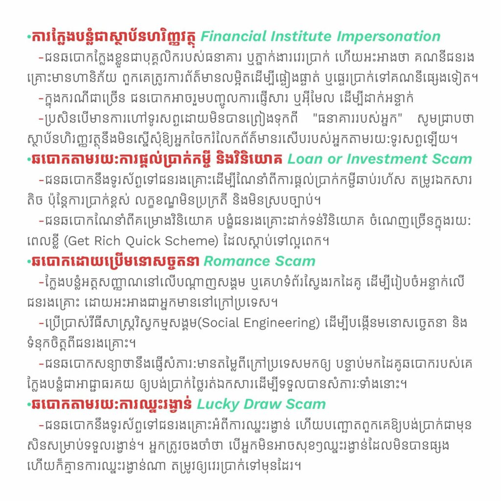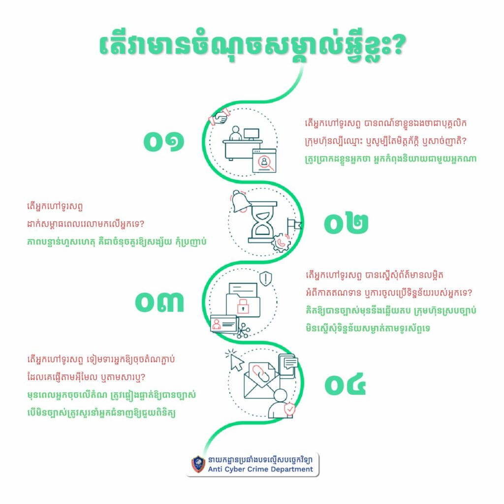 ប្រសិនអ្នកទទួលការហៅទូរសព្ទពីលេខប្លែក និងមិនបានព្រៀមទុកអ្នកត្រូវខ្លួនឯង ត្រូវសម្គាល់ចំនួន៤ចំណុចធំៗ ដើម្បីជៀសវាងធ្លាក់ក្នុងអន្ទាក់ជនឆបោក៖ តើអ្នកហៅទូរសព្ទ បានពណ៌នាខ្លួនឯងថាជាបុគ្គលិក ក្រុមហ៊ុនល្បីឈ្មោះ ឬសូម្បីតែមិត្តភ័ក្ដិ ឬសាច់ញាតិ? ត្រូវប្រាកដខ្លួនអ្នកថា អ្នកកំពុងនិយាយជាមួយអ្នកណាឱ្យពិតប្រាកដ, តើអ្នកហៅទូរសព្ទ ដាក់សម្ពាធពេលវេលាមកលើអ្នកទេ?, ភាពបន្ទាន់ហួសហេតុ គឺជាចំនុចគួរឱ្យសង្ស័យ កុំប្រញាប់, តើអ្នកហៅទូរសព្ទ បានស្នើសុំព័ត៌មានលម្អិត អំពីកាតឥណទាន ឬការចូលប្រើទិន្នន័យរបស់អ្នកទេ?, គិតឱ្យបានច្បាស់មុននឹងឆ្លើយតប ក្រុមហ៊ុនស្របច្បាប់ មិនស្នើសុំទិន្នន័យសម្ងាត់តាមទូរស័ព្ទទេ, តើអ្នកហៅទូរសព្ទ ទៀមទារអ្នកឱ្យចុចតំណភ្ជាប់ដែលគេផ្ញើតាមអ៊ីមែល ឬតាមសារឬ?, មុនពេលអ្នកចុចលើតំណ ត្រូវផ្ទៀងផ្ទាត់ឱ្យបានច្បាស់ បើមិនច្បាស់ត្រូវសួរនាំអ្នកជំនាញឱ្យជួយពិនិត្យ។