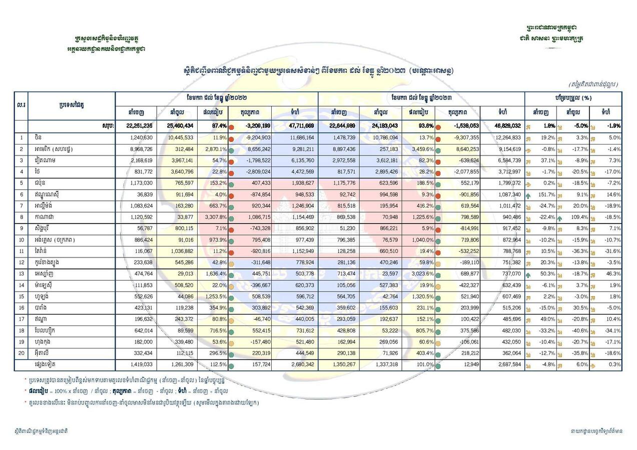 ដោយឡែកចំពោះការនាំចូលវិញ បើតាមរបាយការណ៍បានបង្ហាញថា កម្ពុជានាំចូលទំនិញក្នុងបរិមាណចំនួន ២៤,១៨៣,០៤៣,០០០ដុល្លារ ធ្លាក់ចុះ ៥ភាគរយ បើធៀបនឹងឆ្នាំ២០២២ ចំនួន ២៥,៤៦០,៤៣៤,០០០ដុល្លារ។