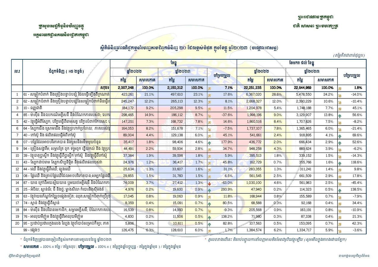 របាយការណ៍ដដែល បានបន្ថែមថា ពេញមួយឆ្នាំ២០២៣នេះ កម្ពុជានាំចេញទំនិញទៅផ្សារអន្តរជាតិ មានទឹកប្រាក់ចំនួន ២២,៦៤៤,៩៨៩,០០០ដុល្លារកើនឡើង១.៨ភាគរយ បើធៀបនឹងរយៈពេលដូចគ្នា ឆ្នាំ២០២២ មានទឹកប្រាក់ ២២,២៥១,២៣៥,០០០ដុល្លារ។