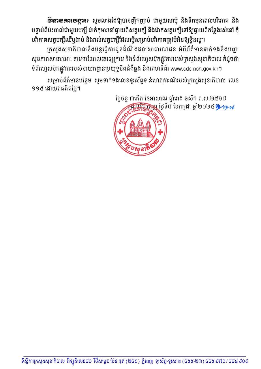 ក្រសួងសុខាភិបាល សូមជម្រាបជូនថា មានជំងឺផ្តាសាយបក្សី កើតលើក្មេងស្រី អាយុ៥ឆ្នាំ ចំនួន ០១ករណីទៀត និងត្រូវបានបញ្ជាក់ថា វិជ្ជមានវីរុសផ្តាសាយបក្សី ប្រភេទហាស់៥ អ៊ុន១ (H5N1) ពីវិទ្យាស្ថានជាតិសុខភាពសាធារណៈ នៅថ្ងៃទី៧ ខែកក្កដា ឆ្នាំ២០២៤ ដែលមានទីលំនៅ ក្នុងភូមិពោធិ៍ ឃុំព្រះបាទជាន់ជុំ ស្រុកគីរីវង្ស ខេត្តតាកែវ។ ក្មេងស្រីនេះ មានគ្រុនក្តៅ និងត្រូវជាបងជីដូនមួយ ក្មេងប្រុសអាយុ៣ឆ្នាំវិជ្ជមានកាលពីថ្ងៃទី៥ ខែកក្កដា ឆ្នាំ២០២៤ ព្រមទាំងរស់នៅផ្ទះជាមួយគ្នា។ បច្ចុប្បន្ន ស្ថានភាពអ្នកជំងឺមានអាការៈស្រាល និងកំពុងទទួលបានការថែទាំយ៉ាងយកចិត្តទុកដាក់ពីសំណាក់ក្រុមគ្រូ ពេទ្យ។ តាមការសាកសួរបង្ហាញថា ប្រហែល១០ថ្ងៃមុនចាប់ផ្តើមឈឺ នៅភូមិមានមាន់ទាងាប់ ហើយនៅផ្ទះ អ្នកជំងឺបានយកមកធ្វើម្ហូបបរិភោគ ក្មេងស្រីបានប៉ះពាល់មាន់ងាប់។
