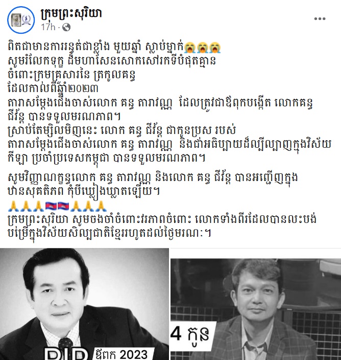 យោងតាមការបង្ហោះរបស់ហ្វេសប៊ុកផេក ក្រុមព្រះសុរិយា បានឱ្យដឹងថា «ពិតជាមានការរន្ធត់ជាខ្លាំងមួយឆ្នាំ​ស្លាប់ម្នាក់!សូមរំលែកទុក្ខ​ដ៏មហាសែនសោកសៅរកទីបំផុត​គ្មាន​ចំពោះក្រុមគ្រួសារនៃ​ត្រកូល​គន្ធ​ ដែលកាលពីឆ្នាំ២០២៣​ តារាសម្ដែងជើងចាស់លោក គន្ធ តារាវណ្ណ ដែលត្រូវជាឪពុក​បង្កេីត​ លោកគន្ធ​ ជីវ័ន្ត​ បានទទួលមរណភាព។ ស្រាប់តែម្សិលមិញនេះ​ លោក​ គន្ធ​ ជីវ័ន្ត​ ជាកូនប្រុស​ របស់តារាសម្ដែងជើងចាស់លោក គន្ធ តារាវណ្ណ និងជាអធិប្បាយដ៏ល្បីល្បាញក្នុងវិស័យកីឡា​ ប្រចាំប្រទេសកម្ពុជា​ បានទទួលមរណភាព។ សូមវិញ្ញាណក្ខន្ធលោក គន្ធ តារាវណ្ណ និងលោក​ គន្ធ​ ជីវ័ន្ត​ បានអញ្ជេីញក្នុងឋានសុគតិភព កុំបីឃ្លៀងឃ្លាតឡើយ។ ក្រុមព្រះសុរិយា​ សូមចងចាំចំពោះវរភាពចំពោះ​ លោកទាំងពីរដែលបានលះបង់បម្រេីក្នុងវិស័យសិល្បជាតិខ្មែររហូតដល់ថ្ងៃមរណៈ»។