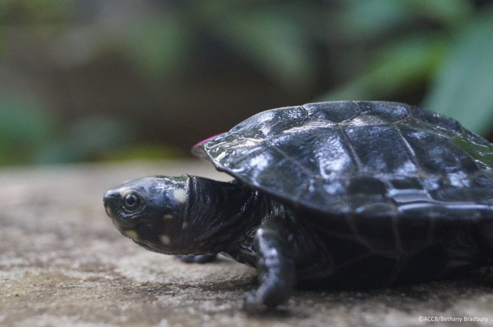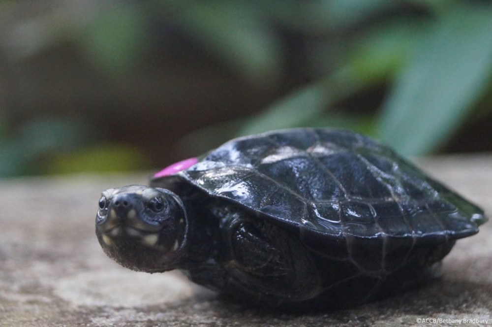 អណ្តើកក្អែកជាប្រភេទរងគ្រោះថ្នាក់ជិតផុតពូជ ដែលមានដើមកំណើតនៅតែក្នុងតំបន់អាស៊ីអាគ្នេយ៍ប៉ុណ្ណោះ ពួកវាកំពុងប្រឈមនឹងការគំរាមកំហែងមួយចំនួន រួមមានការធ្វើទោហនកម្មសត្វព្រៃ (ការជួញដូរ) សម្រាប់ការប្រើប្រាស់ជាលក្ខណៈជាតិ និងអន្តរជាតិ ការជួញដូរនិងការបាត់បង់ទីជម្រក។ អណ្តើកនោះមានពណ៌ខ្មៅសុទ្ធ និងមានស្នាមអុចពពាលពណ៌សមួយចំនួននៅលើផ្ទៃមុខរបស់ពួកវា ហើយត្រូវបានគេស្គាល់ថា Smiling Terrapin ដោយទម្រង់មាត់រាងកោងឡើងលើរបស់ពួកវា។ មេបារបស់កូនអណ្តើកនេះត្រូវបានសង្គ្រោះពីការលក់ដូរដោយខុសច្បាប់នៅតាមចិញ្ចើមថ្នល់។ នេះបញ្ជាក់ពីការចាប់ផ្តើមនៃកិច្ចខិតខំប្រឹងប្រែងរបស់ ACCB ក្នុងការបង្កើតនូវចំនួនប្រជាសាស្ត្រ ដែលធានាឱ្យបានជោគជ័យសម្រាប់អណ្តើកប្រភេទនេះ។