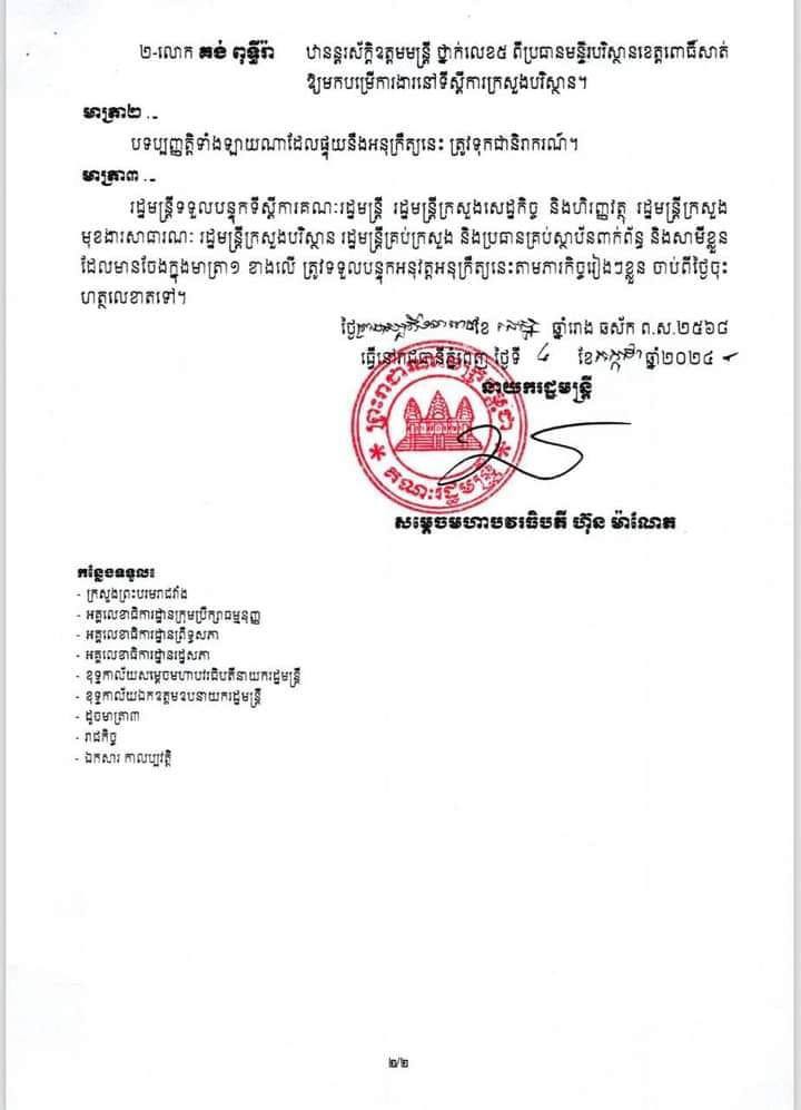 សម្តេចមហាបវរធិបតី ហ៊ុន ម៉ាណែត សម្រេចផ្ទេរភារកិច្ចមន្ត្រីរាជការចំនួន ២រូប របស់ក្រសួងបរិស្ថាន ដូចមានរាយនាមខាងក្រោម៖