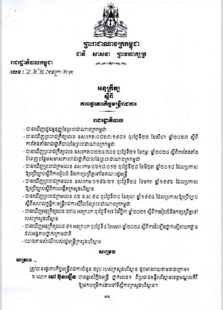 រាជរដ្ឋាភិបាលកម្ពុជា ចេញអនុក្រឹត្យផ្ទេរប្រធានមន្ទីរបរិស្ថានខេត្តមណ្ឌលគិរី និងពោធិ៍សាត់ ឱ្យមកបម្រើការងារនៅទីស្តីការក្រសួងវិញ