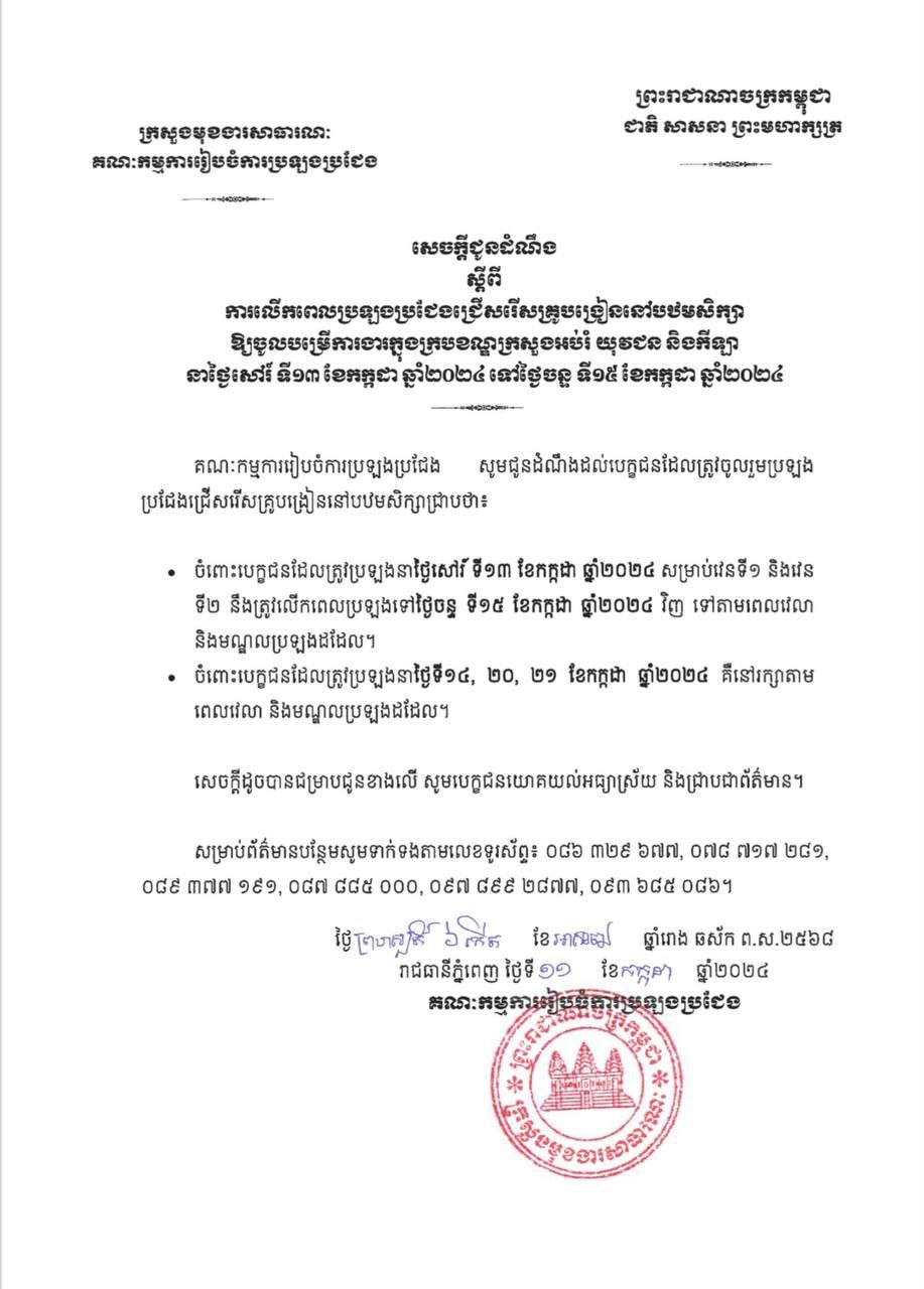 ដោយមានភាពចាំបាច់ គណៈកម្មការអន្តរក្រសួងបានសម្រេចលើកពេលប្រឡងចំនួន១ថ្ងៃ ពោលគឺត្រូវលើកពេលថ្ងៃសៅរ៍ ទី១៣ ខែកក្កដា ឆ្នាំ២០២៤ សម្រាប់វេនទី១ និងវេនទី២ ទៅប្រឡងនាថ្ងៃចន្ទ ទី១៥ ខែកក្កដា ឆ្នាំ២០២៤ វិញ។ មុននឹងឈានចូលទៅដល់ការសម្រេចចិត្តផ្លាស់ប្តូរពេលវេលារយៈពេល ១ថ្ងៃនេះ គណៈកម្មការរៀបចំការប្រឡងប្រជែង បានគិតគូរពិចារណា ថ្លឹងថ្លែងយ៉ាងល្អិតល្អន់ គ្រប់ទិដ្ឋភាពទាំងអស់ ទាំងការរៀបចំ ទាំងស្ថានភាពបេក្ខជនដែលចូលរួមប្រឡងប្រជែង។