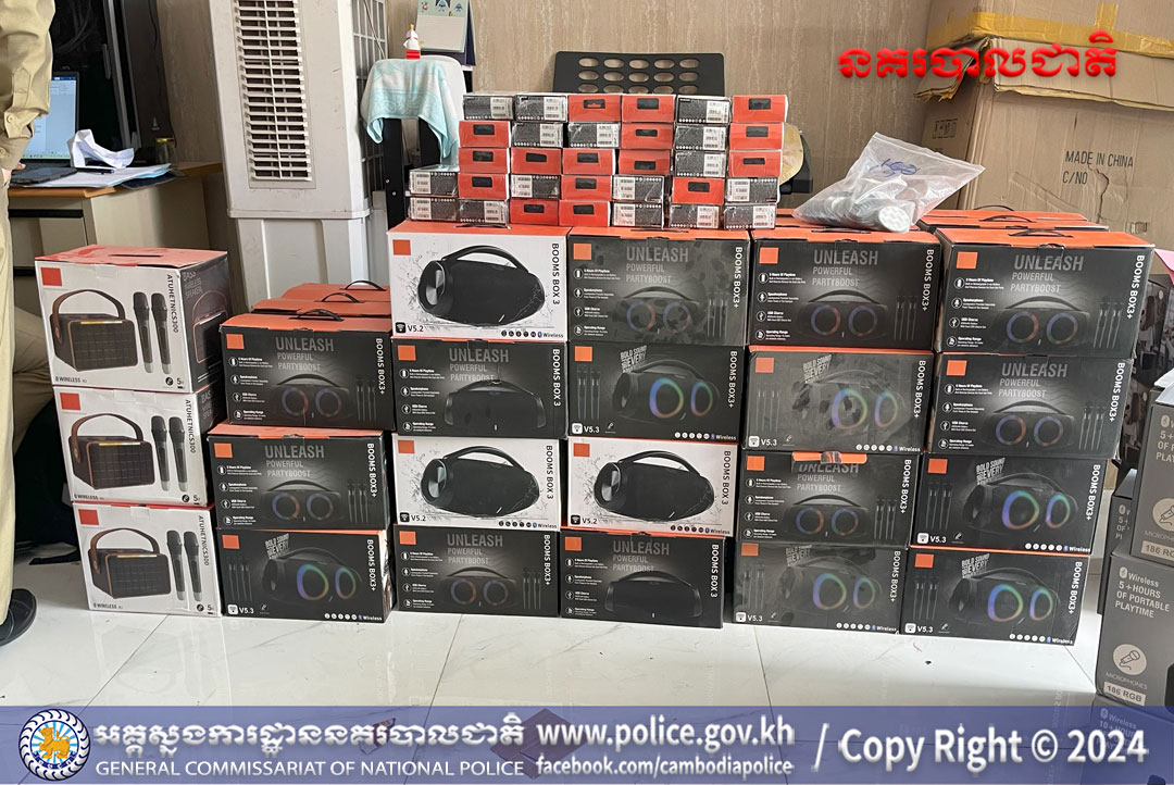 សមត្ថកិច្ច ចុះបង្ក្រាបទីតាំងនាំចូល ស្តុក ចែកចាយ ឧបករណ៍បំពងសម្លេងម៉ាក JBL ក្លែងក្លាយចំនួន ២កន្លែង ក្នុងរាជធានីភ្នំពេញ