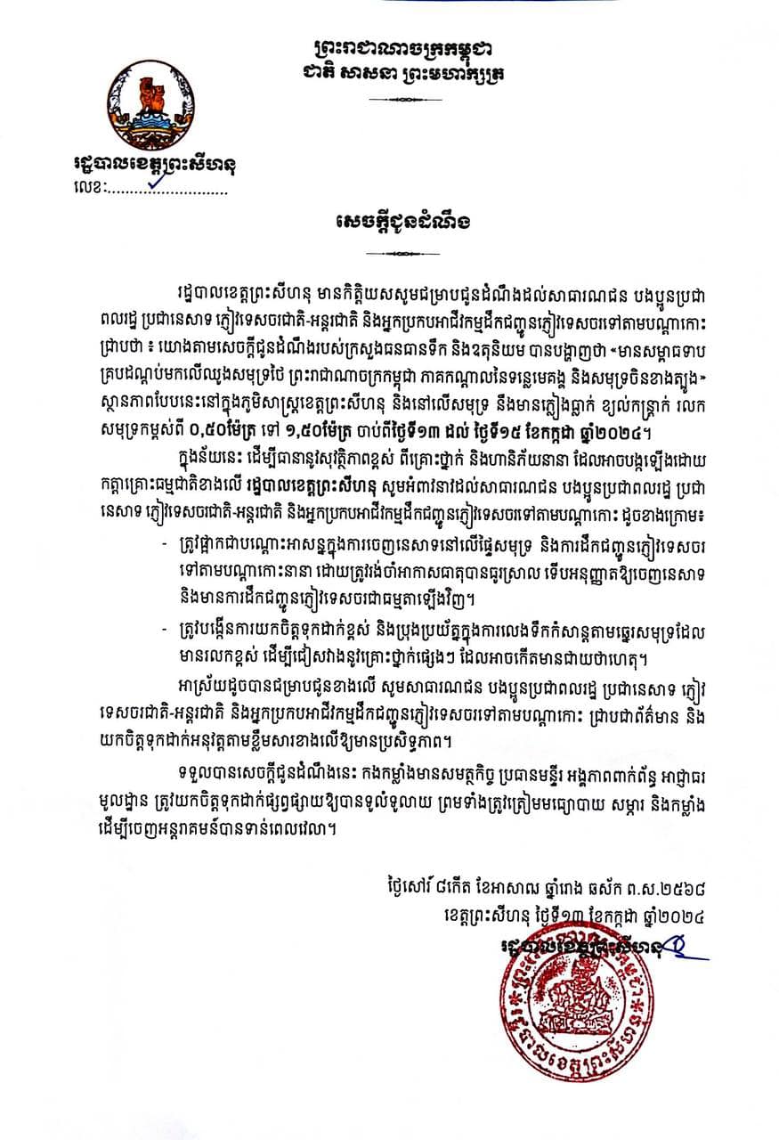 ខេត្តព្រះសីហនុ៖ នៅថ្ងៃទី១៣ ខែកក្កដា ឆ្នាំ២០២៤ យោងតាមការចុះផ្សាយរបស់ រដ្ឋបាលខេត្តព្រះសីហនុ បានចេញសេចក្ដី ជូនដំណឹងដល់សាធារណជន បងប្អូនប្រជាពលរដ្ឋ ប្រជានេសាទ ភ្ញៀវទេសចរជាតិ-អន្តរជាតិ និងអ្នកប្រកបអាជីវកម្មដឹកជញ្ជូនភ្ញៀវទេសចរទៅតាមបណ្តាកោះឱ្យបានជ្រាបថា៖