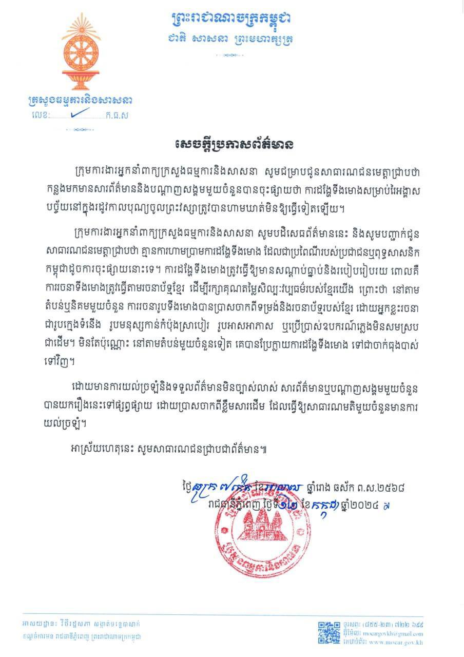 ក្រុមការងារអ្នកនាំពាក្យក្រសួងធម្មការនិងសាសនា សូមបដិសេធព័ត៌មាននេះ និងសូមបញ្ជាក់ជូន សាធារណជនមេត្តាជ្រាបថា គ្មានការហាមប្រាមការដង្ហែទីងមោង ដែលជាប្រពៃណីរបស់ប្រជាជនឬពុទ្ធសាសនិក កម្ពុជាដូចការចុះផ្សាយនោះទេ។ ការដង្ហែទីងមោងត្រូវធ្វើឱ្យមានសណ្តាប់ធ្នាប់និងរបៀបរៀបរយ ពោលគឺ ការរចនាទីងមោងត្រូវធ្វើតាមរចនាប័ទ្មខ្មែរ ដើម្បីរក្សាគុណតម្លៃសិល្បៈវប្បធម៌របស់ខ្មែរយើង ព្រោះថា នៅតាមតំបន់ឬនិគមមួយចំនួន ការរចនារូបទីងមោងបានប្រាសចាកពីទម្រង់និងរចនាប័ទ្មរបស់ខ្មែរ ដោយអ្នកខ្លះរចនា ជារូបក្មេងទំនើង រូបមនុស្សកាន់កំប៉ុងស្រាបៀរ រូបអាសអាភាស ឬប្រើប្រាស់ឧបករណ៍ភ្លេងមិនសមស្រប ជាដើម។ មិនតែប៉ុណ្ណោះ នៅតាមតំបន់មួយចំនួនទៀត គេបានប្រែក្លាយការដង្ហែទីងមោង ទៅជាចាក់ធុងបាស់ ទៅវិញ។