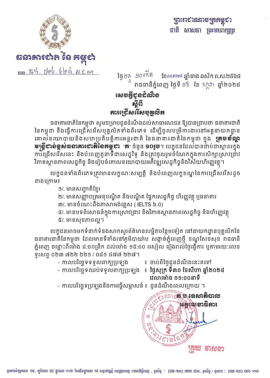 រាជធានីភ្នំពេញ៖ នៅថ្ងៃទី១៦​ ខែកក្កដា ឆ្នាំ២០២៤ យោងតាមការចុះផ្សាយរបស់ ធនាគារជាតិ នៃកម្ពុជា បានចេញសេចក្ដីជូនដំណឹងដល់សាធារណជន ឱ្យបានជ្រាបថា ធនាគារជាតិនៃកម្ពុជា នឹងធ្វើការជ្រើសរើសបុគ្គលិកទាំងពីរភេទ ដើម្បីចូលបម្រើការងារនៅអគ្គនាយកដ្ឋាន គោលនយោបាយនិងសហប្រតិបត្តិការអន្តរជាតិ នៃធនាគារជាតិនៃកម្ពុជា ក្នុងក្របខ័ណ្ឌ មន្ត្រីជាន់ខ្ពស់ធនាគារជាតិនៃកម្ពុជា “ក” ចំនួន ១០រូប។