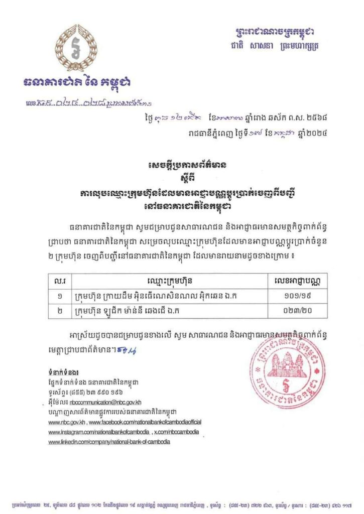 (ភ្នំពេញ)៖ ធនាគារជាតិ នៃកម្ពុជា នៅថ្ងៃទី១៨ ខែកក្កដា ឆ្នាំ២០២៤នេះ បានចេញសេចក្តីប្រកាសព័ត៌មាន លុបឈ្មោះក្រុមហ៊ុន២ ដែលមានអាជ្ញាបណ្ណប្ដូរប្រាក់ចេញពីបញ្ជីនៅធនាគារជាតិនៃកម្ពុជា។