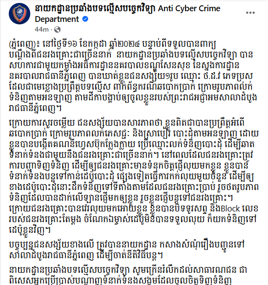 រាជធានីភ្នំពេញ៖ យោងតាមការចុះផ្សាយរបស់ នាយកដ្ឋានប្រឆាំងបទល្មើសបច្ចេកវិទ្យា បានឱ្យដឹងថា នៅថ្ងៃទី១៦ ខែកក្កដា ឆ្នាំ២០២៤ បន្ទាប់ពីទទួលបានពាក្យបណ្ដឹងពីជនរងគ្រោះជាច្រើននាក់ នាយកដ្ឋានប្រឆាំងបទល្មើសបច្ចេកវិទ្យា បានសហការជាមួយកម្លាំងអធិការដ្ឋាននគរបាលខណ្ឌសែនសុខ នៃស្នងការដ្ឋាននគរបាលរាជធានីភ្នំពេញ បានឃាត់ខ្លួនជនសង្ស័យ១រូប ឈ្មោះ ថ.ដ.វ ភេទប្រុស ដែលជាមេខ្លោងប្រព្រឹត្តបទល្មើស ពាក់ព័ន្ធករណីឆបោកប្រាក់ ក្រោមរូបភាពលក់ទំនិញតាមអនឡាញ តាមដីកាបង្គាប់ឲ្យចូលខ្លួនរបស់ព្រះរាជអជ្ញាអមសាលាដំបូងរាជធានីភ្នំពេញ។