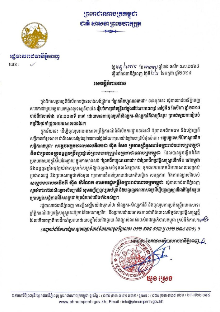រដ្ឋបាលរាជធានីភ្នំពេញ សូមអំពាវនាវដល់សិល្បករ-សិល្បការិនី សូមអញ្ជើញចូលរួមសម្ដែង និងបញ្ចេញទេពកោសល្យដើម្បីបង្ហាញស្មារតីជាតិខ្មែរតែមួយក្រោមម្លប់សន្តិភាពដ៏សែនត្រជាក់ត្រជុំរបស់យើងទាំងអស់គ្នា ដើម្បីចូលរួមអបអរសាទរព្រឹត្តិការណ៍បើកការដ្ឋានឱ្យបានអធិកអធម និងបង្ហាញពីសក្ខីភាពគាំទ្រសាទរ ជាពិសេសសម្តែងនូវការគោរពថ្លែងអំណរគុណយ៉ាងជ្រាលជ្រៅបំផុតចំពោះ អគ្គមគ្គុទេសក៍បិតាស្ថាបនិកសន្តិភាពកម្ពុជា សម្តេចអគ្គមហាសេនាបតីតេជោ ហ៊ុន សែន ប្រធានព្រឹទ្ធសភានៃព្រះរាជាណាចក្រកម្ពុជា និងជាប្រធានក្រុមឧត្តមប្រឹក្សាផ្ទាល់ព្រះមហាក្សត្រនៃព្រះរាជាណាចក្រកម្ពុជា ដែលបានផ្តួចផ្តើមគំនិត ប្រកបដោយចក្ខុវិស័យវែងឆ្ងាយ ក្នុងការសាងសង់ “ព្រែកជីកហ្វូណនតេជោ” ជាព្រែកជីកប្រវត្តិសាស្ត្រលើកទី១ នៅកម្ពុជា និងបន្តពូនជ្រំអនុវត្តយ៉ាងសស្រាក់សស្រាំឱ្យចេញជាសមិទ្ធផលពិតប្រាកដ ទុកជាកេរមរតកដ៏មហាសាលសម្រាប់ប្រជាពលរដ្ឋ និងប្រទេសកម្ពុជាទាំងមូល ក្រោមការដឹកនាំប្រកបដោយគតិបណ្ឌិត សមត្ថភាព និងភាពឈ្លាសវៃរបស់សម្តេចមហាបវរធិបតី ហ៊ុន ម៉ាណែត នាយករដ្ឋមន្ត្រីនៃព្រះរាជាណាចក្រកម្ពុជា។