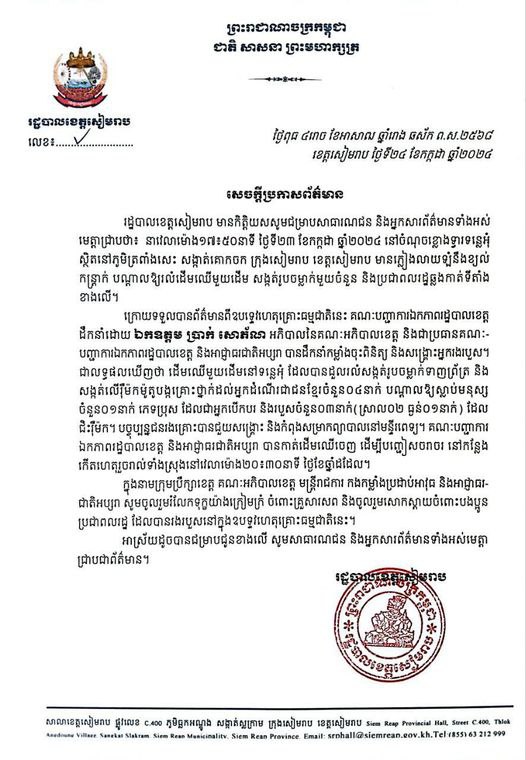 នៅក្នុងសេចក្ដីប្រកាសព័ត៌មាន បានឱ្យដឹងថា នាវេលាម៉ោង១៧៖៥០នាទី ថ្ងៃទី២៣ ខែកក្កដា ឆ្នាំ២០២៤ មានភ្លៀងលាយឡំនឹងខ្យល់ កន្ត្រាក់ បណ្តាលឱ្យដើមឈើមួយដើមនៅទន្លេអុំ បានដួលរលំសង្កត់រូបចម្លាក់ទាញព្រ័ត្រ និង សង្កត់លើរ៉ឺម៉កម៉ូតូបង្កគ្រោះថ្នាក់ដល់អ្នកដំណើរជាជនខ្មែរចំនួន០៤នាក់ បណ្តាលឱ្យស្លាប់មនុស្ស ចំនួន០១នាក់ ភេទប្រុស ដែលជាអ្នកបើកបរ និងរបួសចំនួន០៣នាក់ (ស្រាល០២ ធ្ងន់០១នាក់)។ បច្ចុប្បន្នជនរងគ្រោះបានជួយសង្គ្រោះ និងកំពុងសម្រាកព្យាបាលនៅមន្ទីរពេទ្យ។