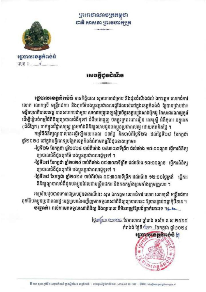 សេចក្តីជូនដំណឹងបញ្ជាក់ថា៖ រដ្ឋបាលខេត្តកំពង់ធំ មានកិត្តិយស សូមគោរពជម្រាប និងជូនដំណឹងដល់ឯកឧត្តម លោកជំទាវ លោក លោកស្រី មន្ត្រីរាជការនិងពុក ម៉ែបងប្អូនប្រជាពលរដ្ឋដែលរស់នៅក្នុងខេត្តកំពង់ធំឱ្យបានជ្រាបថា៖ មន្ទីរសុខាភិបាល ខេត្តបានសហការជាមួយសមាគមគ្រូពេទ្យស្ម័គ្រចិត្តខេត្តយ្យងសាងប៊ុកដូ នៃសាធារណរដ្ឋកូរ៉េ ដើម្បីរៀបចំកម្មវិធីពិនិត្យព្យាបាលជំងឺទូទៅ ជំងឺមាត់ធ្មេញ ថតឆ្លុះក្រពះពោះវៀន រោគស្ត្រី ជំងឺកុមារ ចក្ខុរោគ (ជំងឺភ្នែក) ចាក់ម្ជុលវិជ្ជាសាស្ត្រ ព្រមទាំងពិនិត្យឈាមជូន បងប្អូនប្រជាពលរដ្ឋ ដោយឥតគិតថ្លៃ។